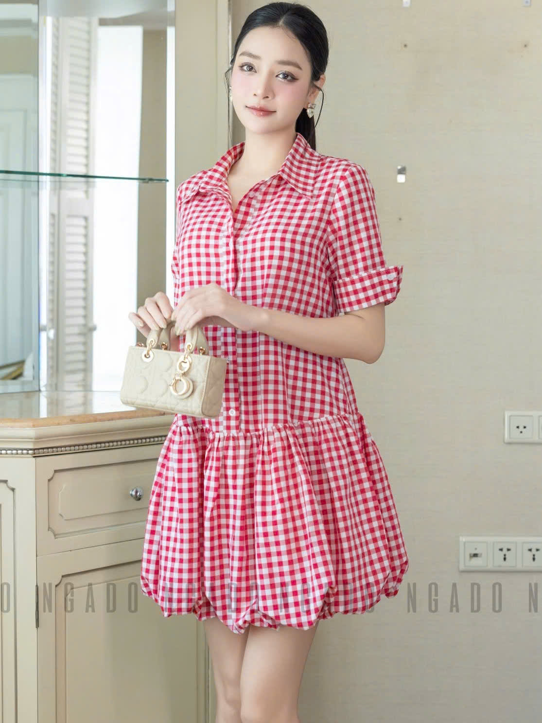 ✨Đầm babydoll caro đỏ cổ sơ mi NGADO , đầm caro , đầm Nữ
