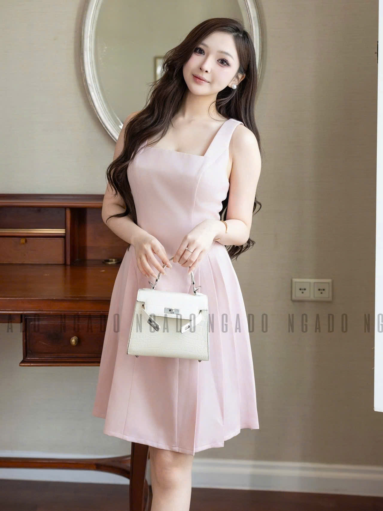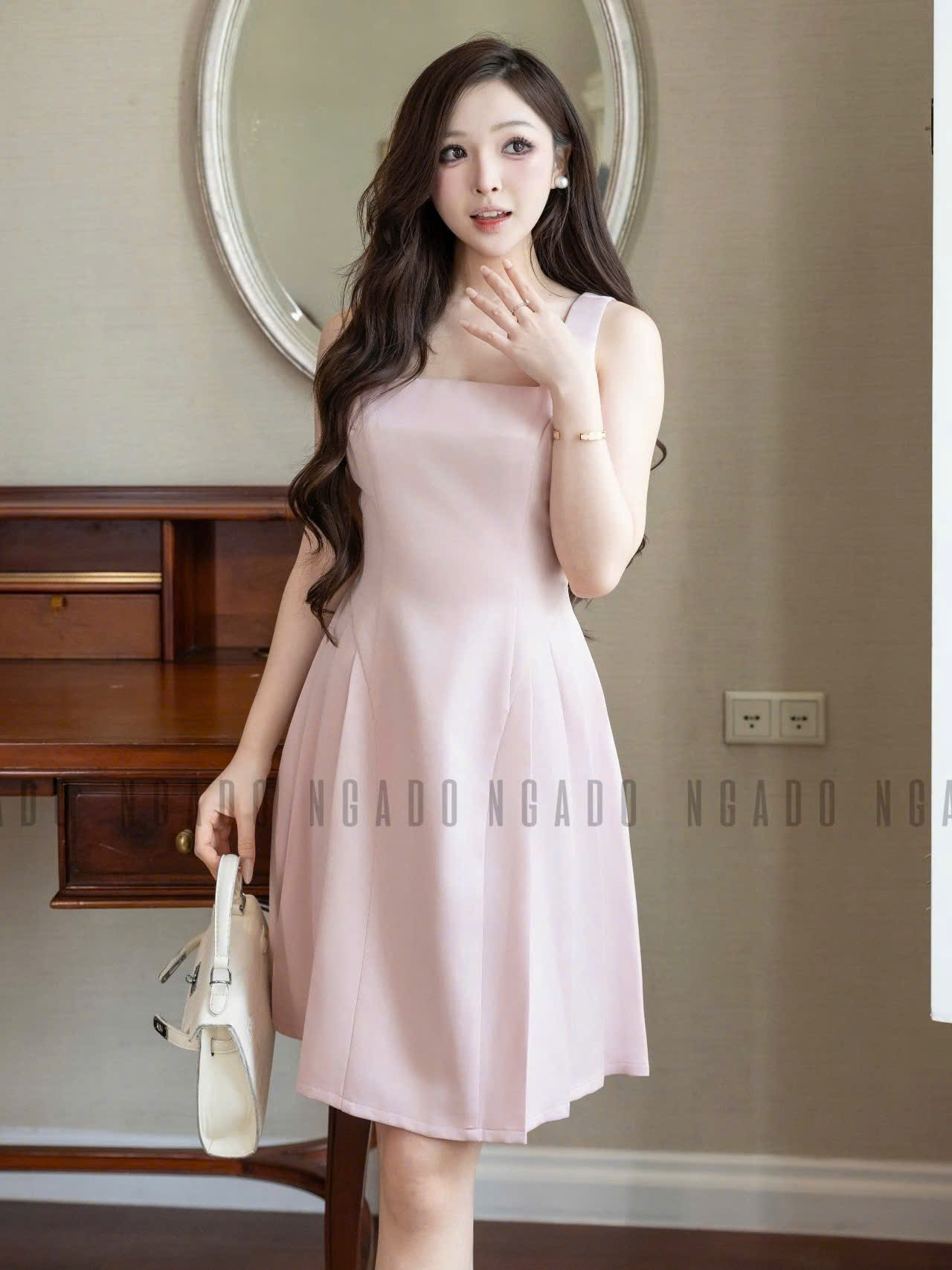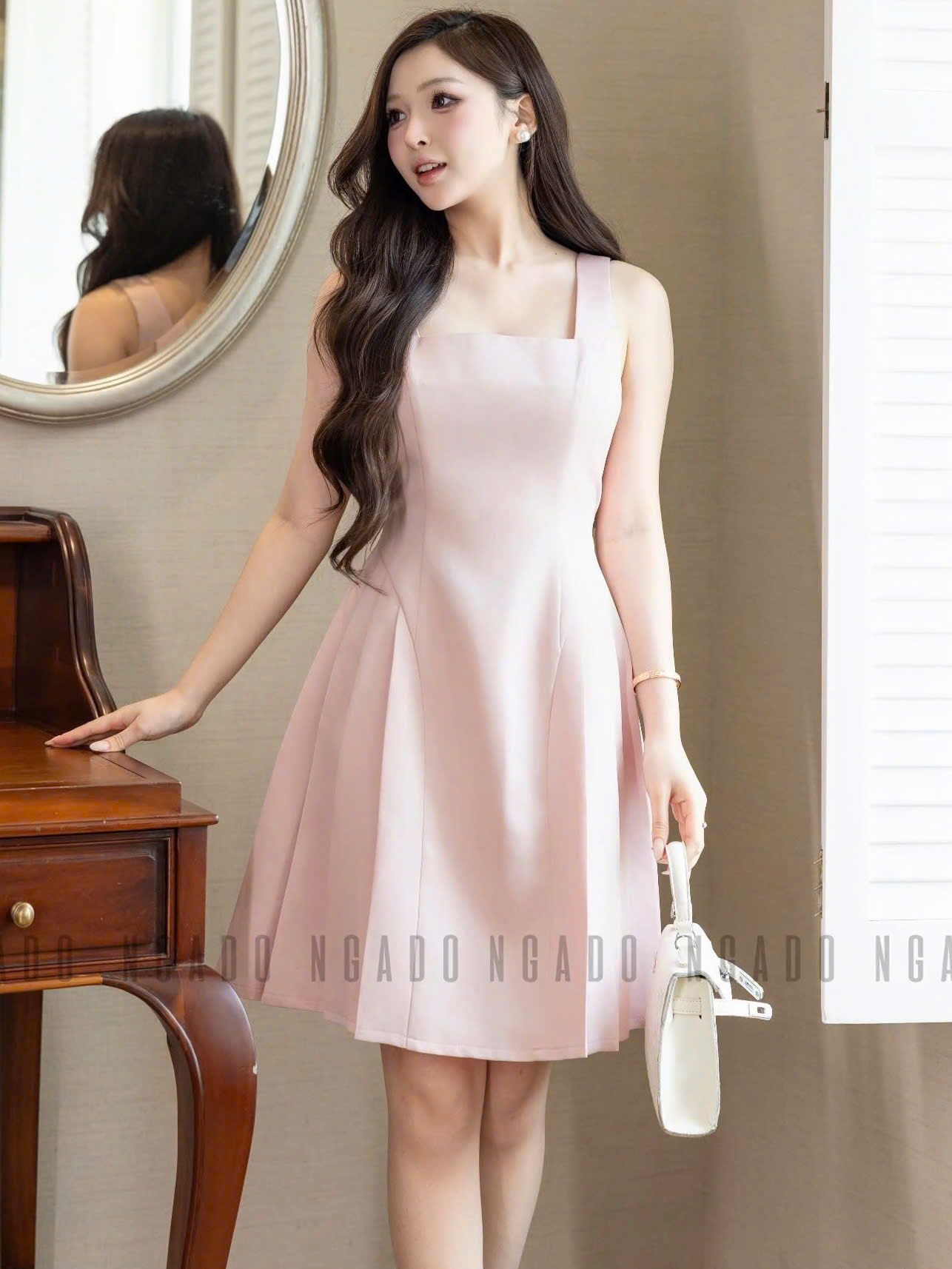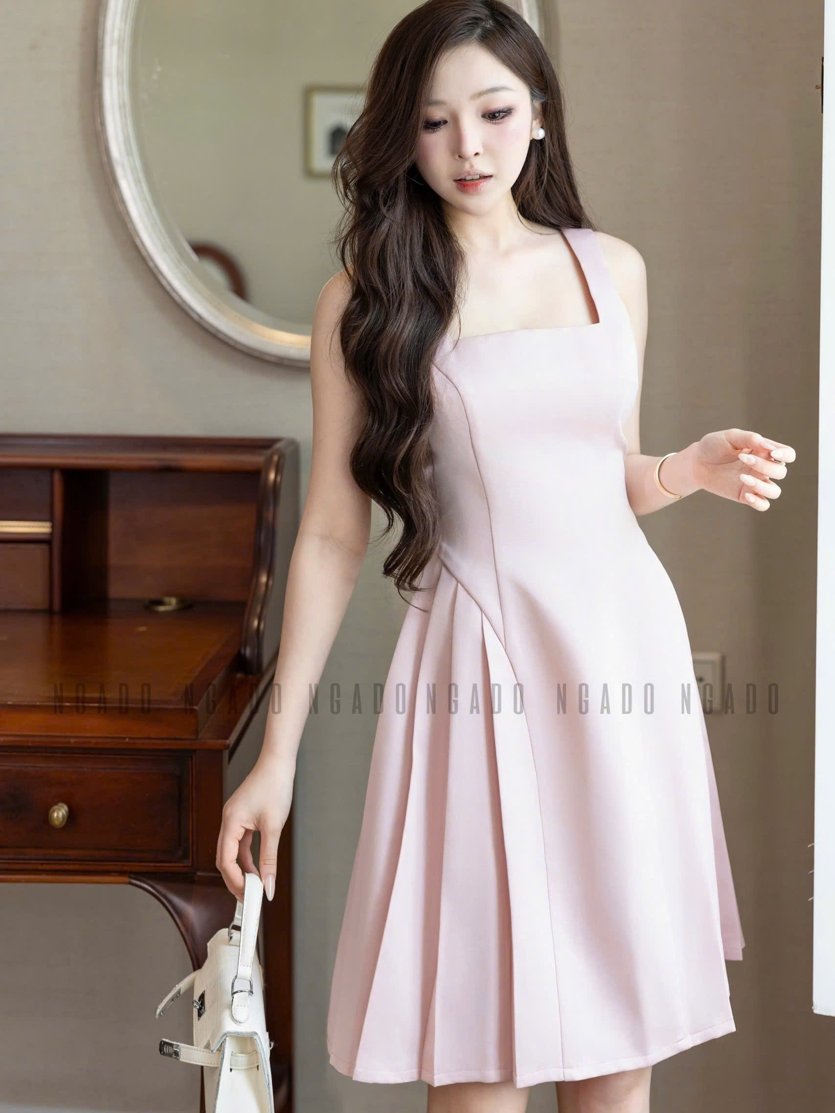 ✨Đầm hồng cổ vuông xếp ly NGADO , đầm xếp ly , đầm dự tiệc , công sở