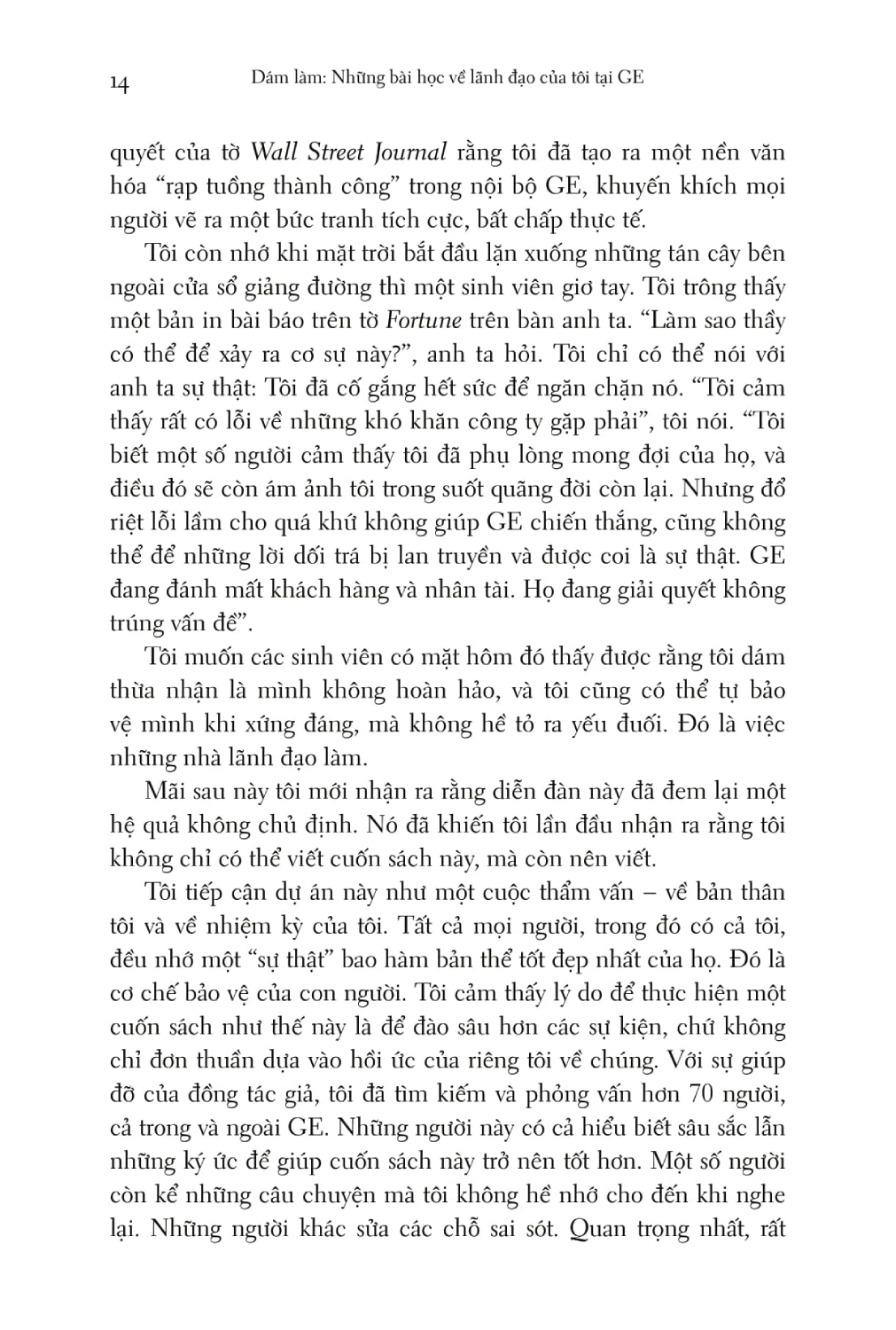 "Dám làm: Những bài học về lãnh đạo của tôi tại GE" không chỉ là một cuốn hồi ký về sự nghiệp của một CEO, mà còn là một bài học về lãnh đạo trong những thời điểm khó khăn. Immelt không né tránh việc thừa nhận các sai lầm của mình, và ông nhấn mạnh tầm quan trọng của việc học hỏi từ những thất bại để tiến lên. Cuốn sách cũng là một minh chứng cho sự phức tạp và áp lực của việc điều hành một tập đoàn toàn cầu, và làm thế nào để một nhà lãnh đạo có thể giữ vững tinh thần, dù cho hoàn cảnh có khó khăn đến đâu. Cuối cùng, đây là một lời nhắc nhở rằng, trong kinh doanh, không có thành công nào đến dễ dàng, và việc lãnh đạo đòi hỏi sự can đảm, kiên nhẫn, và khả năng chịu đựng áp lực khủng khiếp.
