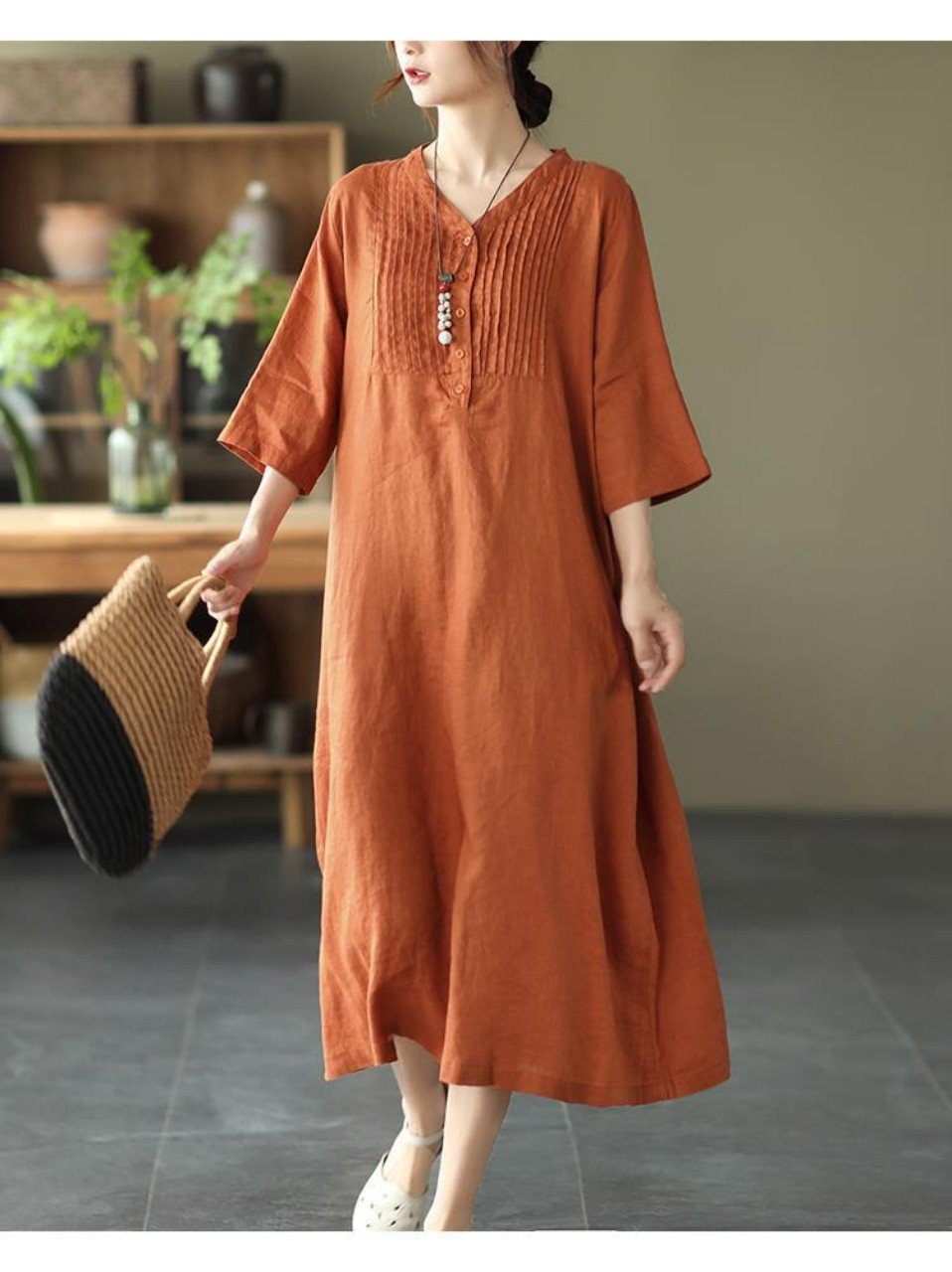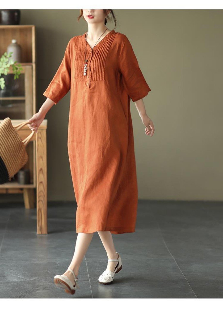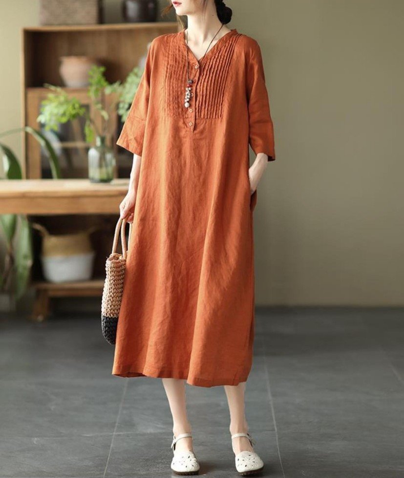 ✨Đầm linen cổ V tay lỡ, form suông dài rộng, style Hàn Quốc trẻ trung NH190 cam