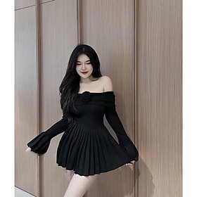 Đầm trễ vai đính hoa tay dài loe form ngắn dáng xòe xếp ly Váy có lót quần nheee , chất len gân tăm len bao đẹpppp S M Sản phẩm này là tài sản