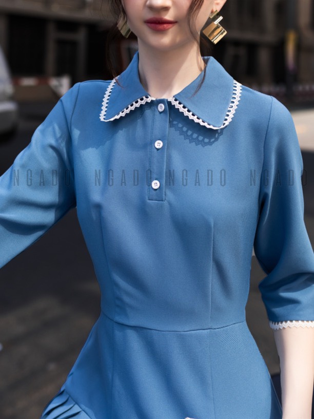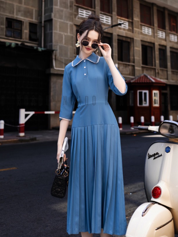 Mã DP217 | Váy Xanh Phối Cúc Xếp Ly Siêu ĐẸP | Váy Đầm Trung Niên | gọi ngay DT ZALO 0345.735.475