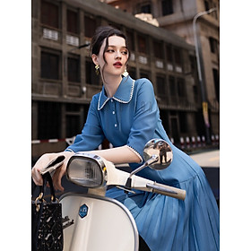 Hàng thiết kế - Đầm xòe xếp ly tay phồng phối nút gỗ kèm nơ cài vintage - VN50235