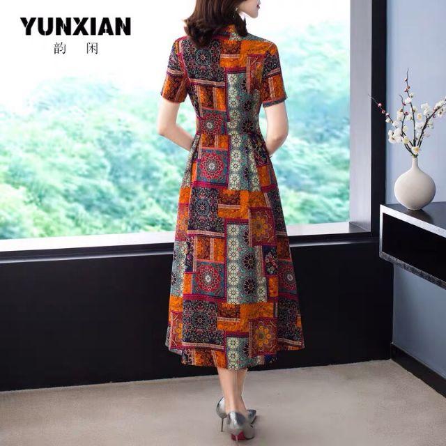 ĐẦM XOÈ HOẠ TIẾT HOA CỔ TRỤ Chất: lụa mango Màu: hoạ tiết như hình Kiểu dáng: đầm xoè cổ trụ, tay ngắn, cài nút trước ẩn, kèm dây thắt eo rời, dây kéo bên
