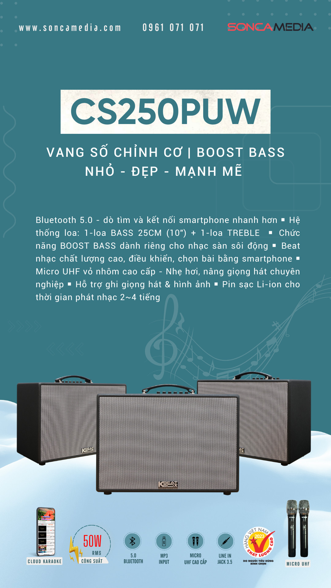 Dàn âm thanh di động xách tay CS250PUW - Loa karaoke di động xách tay CS250PUW   TÍNH NĂNG NỔI BẬT - Nhỏ gọn xách tay - Tích hợp vang số chỉnh cơ - Chức năng boost bass dành riêng cho nhạc sàn sôi động   THÔNG SỐ KỸ THUẬT - Màu sắc : Màu đen - Màu lưới : Lưới Xám (logo KBEATBOX) - Loại thùng : Thùng gỗ bọc da - quai xách - Bluetooth 5.0 - Nguồn cấp : 110~240VAC, 50/60Hz (auto volt) - Pin : Pin sạc Li-ion 15V-2200mAh (33Wh) - Hệ thống loa : BASS 25CM (10") + TREBLE - Công suất RMS : 50W (max) - Công suất PMPO : 300W (max) - Ngõ kết nối : MP3 USB, LINE IN (jack 3.5 mm) - Cân nặng : 8 Kg - Kích thước thùng carton (RxCxS) : 480 x 400 x 265 mm