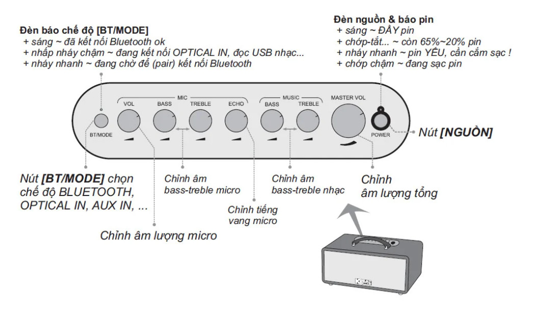 _Nguồn DC 12V bat in _ Bass 2T x 2, Treble x 2, mid x 2 _ Sử dụng bo CLASS D _Hỗ trợ USB, HDMI, Bluetooth, guitar in, mic in _Phụ kiện 2 mic