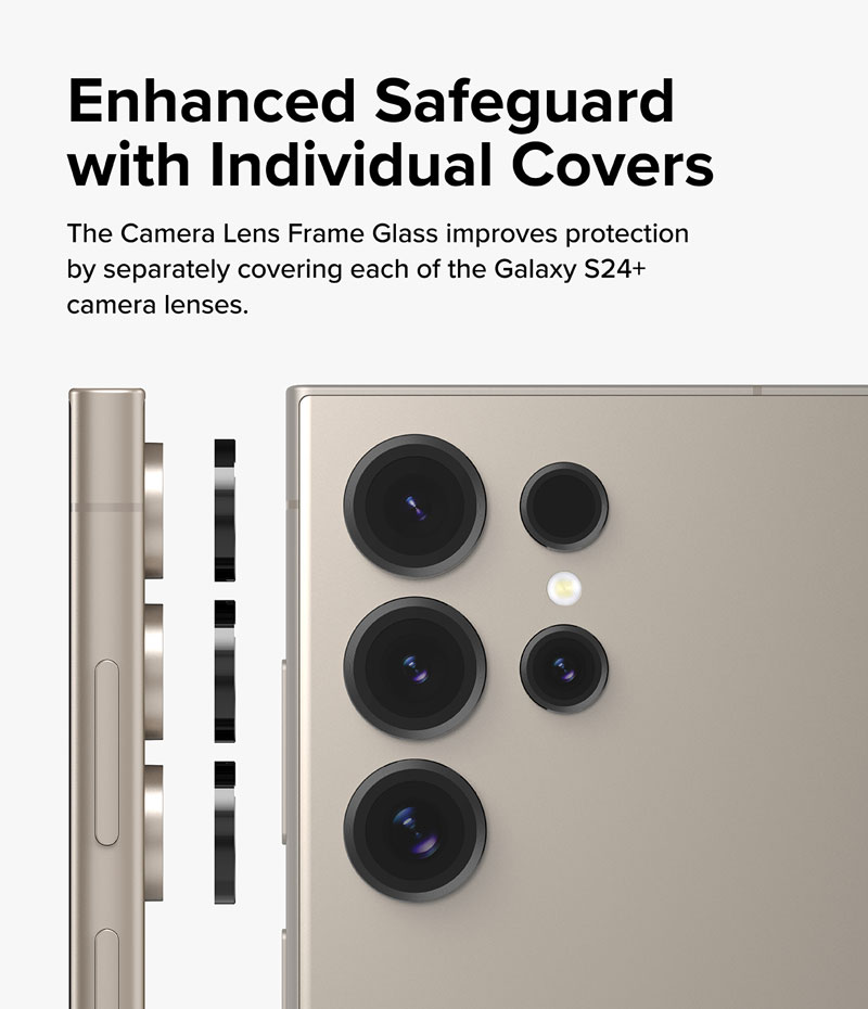 Dán camera Samsung Galaxy S24 Ultra Ringke Lens Frame Glass gồm 3 lens rời, chất liệu kính cường lực trong suốt với khung viền kim loại màu đen bảo vệ tối ưu cho camera, độ trong suốt cao cho phép chụp ảnh với chất lượng rõ nét, không ảnh hưởng tới hiệu năng của camera.