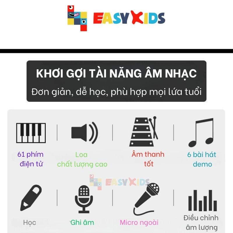 Đàn Organ Đàn Piano Điện Tử Đồ Chơi Cho Bé 61 Phím Sạc Điện không chỉ là một đồ chơi giải trí, mà còn có tính năng giáo dục. Bé có thể học cách nhận biết âm thanh, phân biệt các nút và nhịp điệu âm nhạc. Đồng thời, sản phẩm còn khuyến khích phát triển tư duy trực quan và tăng cường khả năng tập trung và lắng nghe.