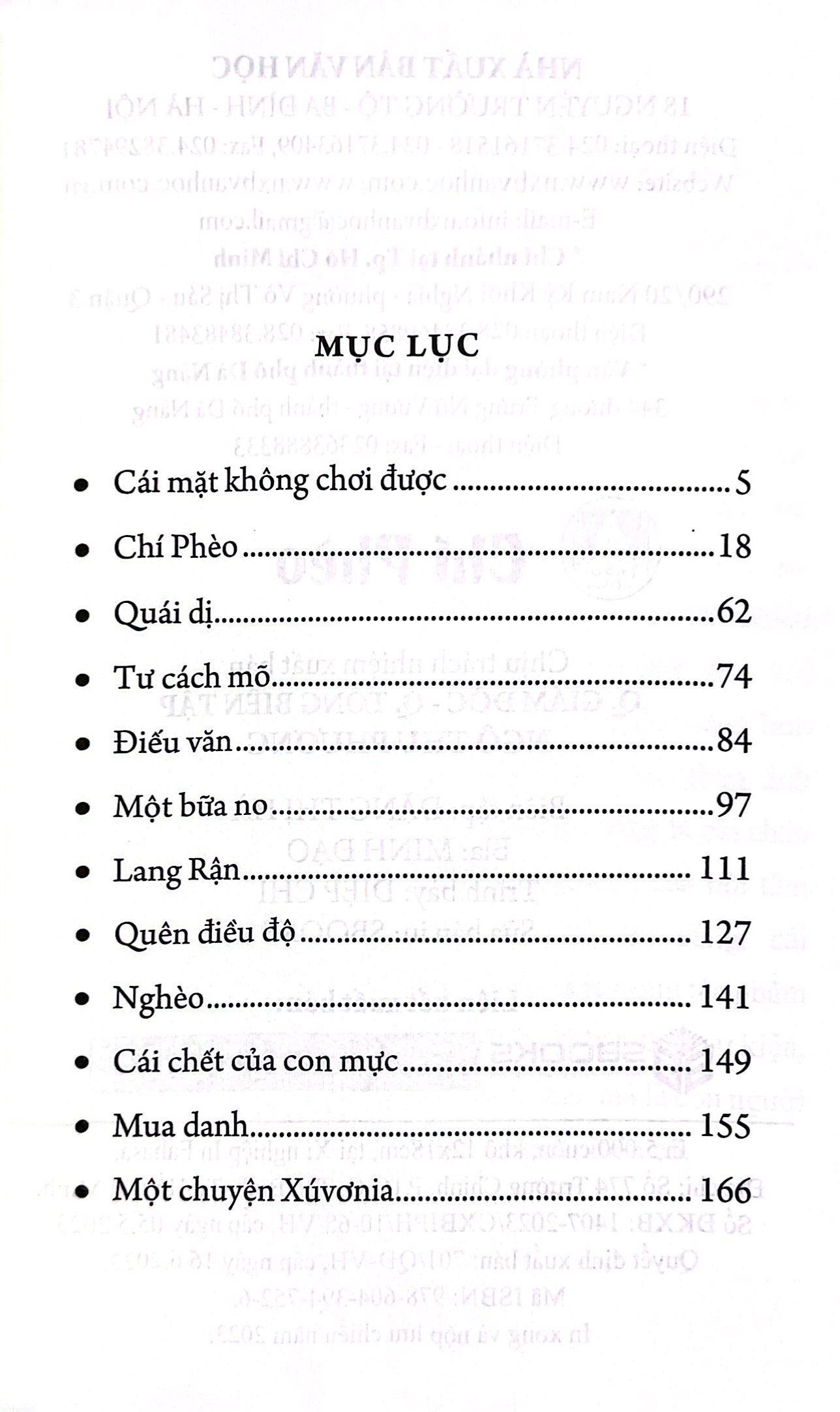 Chí Phèo là tập truyện ngắn với các truyện Cái mặt không chơi được, Chí Phèo, Quái dị, Tư cách mõ, Điếu văn, Một bữa no, Lang rận, Quên điều độ, Nghèo, Cái chết của con mực, Mua danh, Một chuyện Xúvơnia.