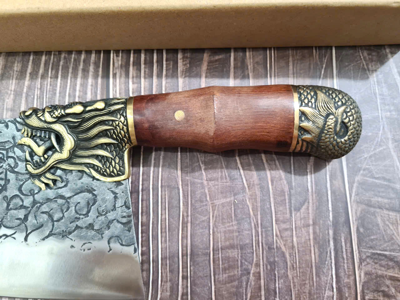 Chất liệu tay cầm: gỗ CẨM LAI, khâu và chuôi cuối dao bằng đồng thau