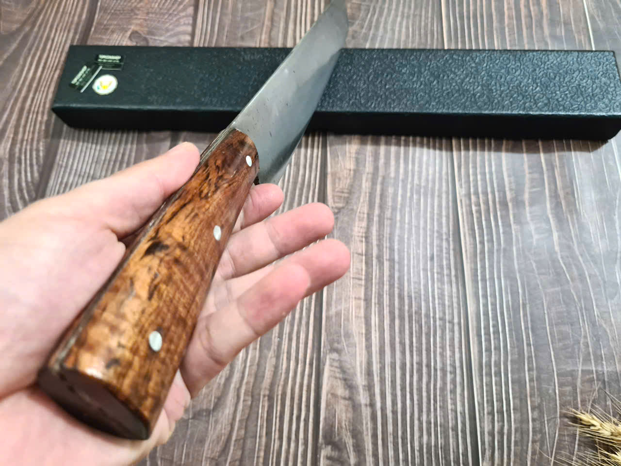 - Chất liệu: 100% thép nhíp ô tô được lựa chọn và kiểm duyệt kỹ càng. - Chất liệu cán: gỗ cẩm chỉ núi - Kích thước: lưỡi: 18cm, cán: 12cm, rộng: 6,5cm, dầy: 0,1,