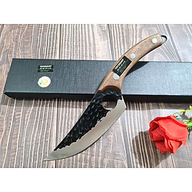 - Chất liệu: 100% thép nhíp ô tô được lựa chọn và kiểm duyệt kỹ càng. - Chất liệu cán: gỗ cẩm chỉ núi - Kích thước: lưỡi: 18cm, cán: 12cm, rộng: 6,5cm, dầy: 0,1,