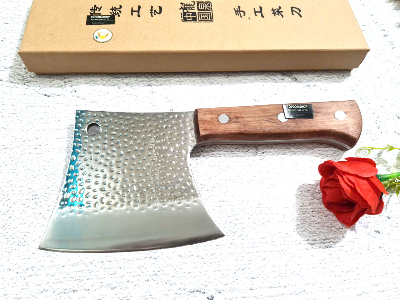 - Chức năng: Chặt xương ống, chân giò, trâu bò - Kích thước: Lưỡi: 22cm, cán: 10cm, rộng: 10cm, dầy: 5ly, trọng lượng: 800g - Cán : Gỗ mun, Khâu đồng đỏ , chốt đinh
