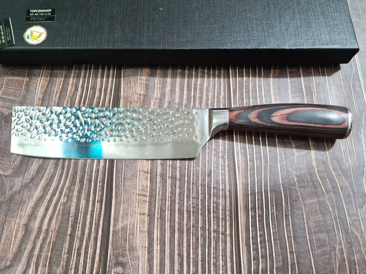 - Chức năng: thái thịt, rau củ quả - Kích thước: Lưỡi: 17cm, cán: 12cm, rộng: 5cm, dầy: 1ly, trọng lượng: 200g - Cán : Gỗ cẩm chỉ, Chốt, Khâu ĐỒNG ĐỎ , keo liên