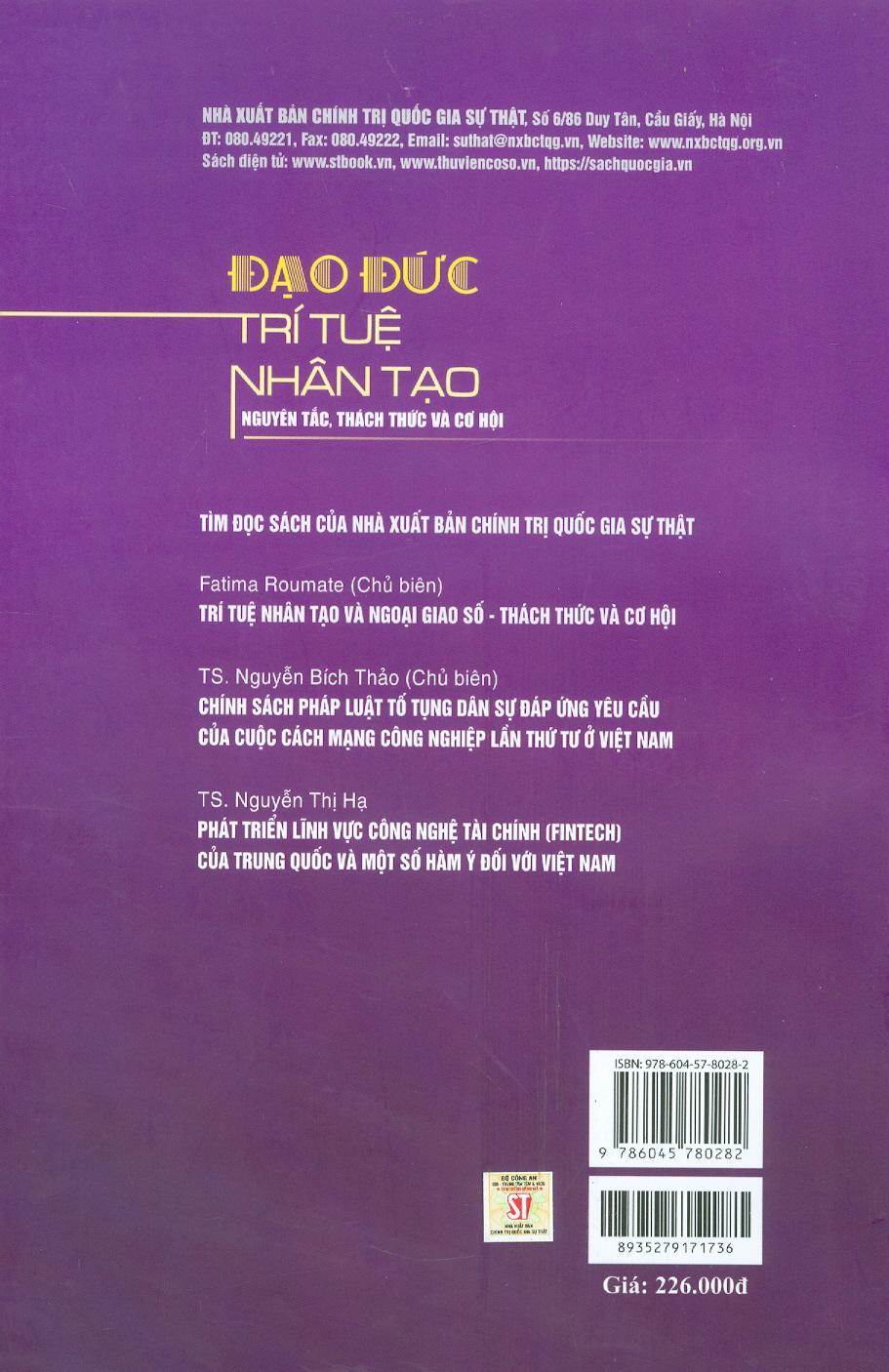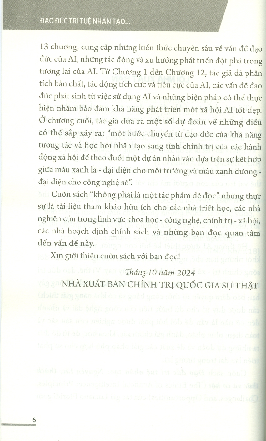 "Đạo đức trí tuệ nhân tạo: Nguyên tắc, thách thức và cơ hội" (The Ethics of Artificial Intelligence: Principles, Challenges, and Opportunities) của tác giả Luciano Floridi gồm 5 ĐẠO ĐỨC TRÍ TUỆ NHÂN TẠO... 13 chương, cung cấp những kiến thức chuyên sâu về vấn đề đạo đức của AI, những tác động và xu hướng phát triển đột phá trong tương lai của AI.