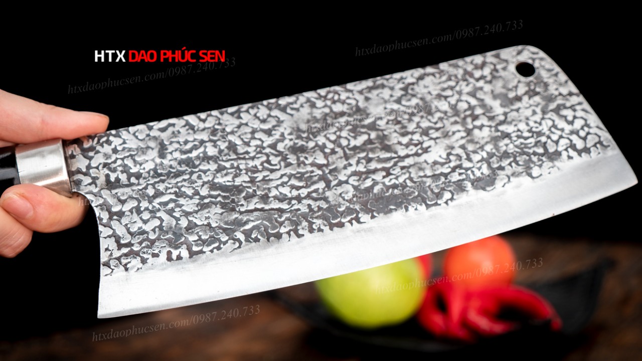Dao chặt gà sắc bén - Thép nhíp ô tô - Cán mun khâu inox - N09TM Lựa chọn nguyên liệu 100% là nhíp ô tô ( Liên xô, Ifa ) được các thợ rèn giỏi gia công tỉ mỉ từ lưỡi dao cho đến cán dao đảm bảo việc băm chặt xương sắc - ngọt. Các sản phẩm của HTX Dao Phúc Sen thợ rèn đều sử dụng than củi khi nung thép cũng như tôi dao để đảm bảo lưỡi dao khi ra lò sắc bén và bền lâu. Nét đặc biệt của mẫu dao này là bề mặt lưỡi dao được thợ rèn giỏi của HTX Dao Phúc Sen đập rèn hoa văn tỉ mỉ đẹp mắt tạo nét khác biệt cho từng con dao và bề mặt hoa văn này còn có tác dụng chống dính bám thực phẩm khi chặt gà,vịt.