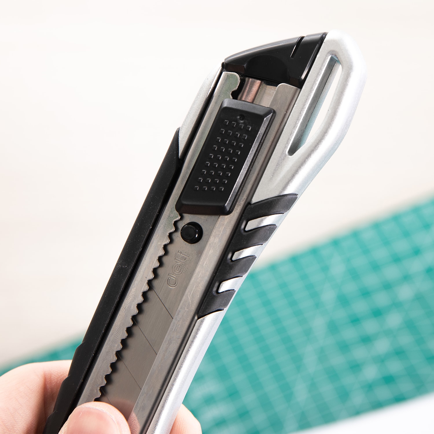 Dao Rọc Giấy - Deli 2043 được thiết kế tiện dụng với chuôi dao dễ mở khi cần thay lưỡi, cán dao cong dễ cầm nắm và điều khiển vết cắt. Lưỡi dao có bản lớn
