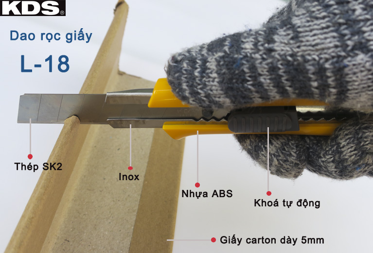 • Dao rọc giấy khóa tự động KDS L-18 có thể cắt được nhiều vật liệu như: Giấy, carton, vải, nhựa, da, ván ép,...rất thích hợp cho mọi người, gia đình, học tập, nhà máy, xí nghiệp....