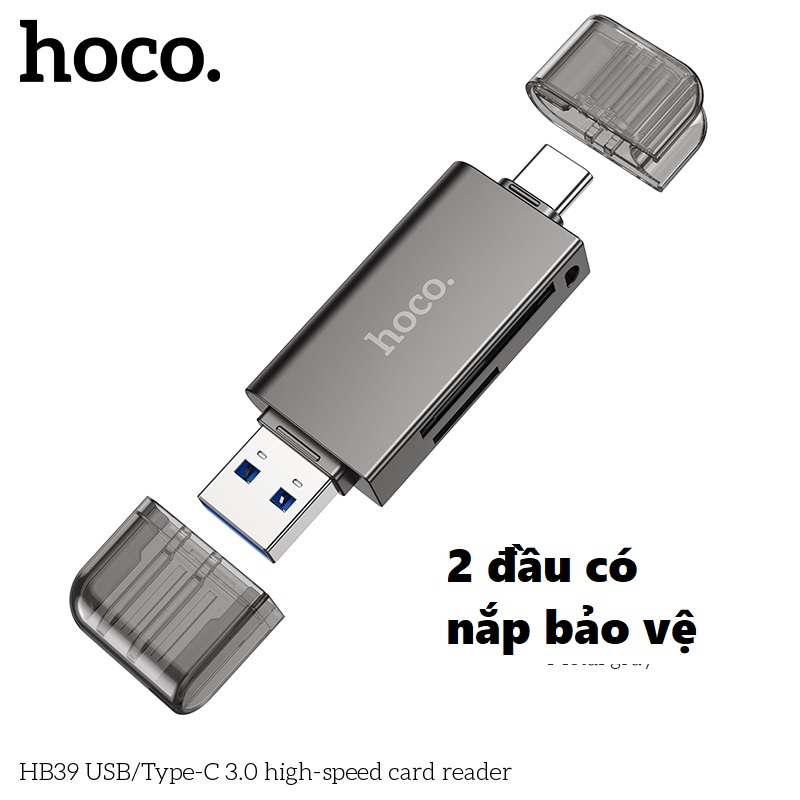 Đầu đọc thẻ nhớ USB thương hiệu hoco. * Model: HB39 -Sản xuất tại: Trung Quốc Mô tả: -Hỗ trợ thể TF và SD card, tối đa 2TB -2 đầu kết nối: Type-C và USB