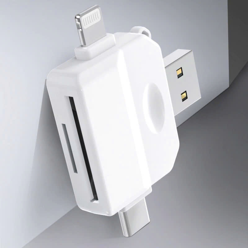 Thông số sản phẩm : Chất liệu : Nhựa ABS Kích thước : 65x65x65 mm Cổng kết nối : Type C, USB, L 8 pin Đầu đọc thẻ : SD ,