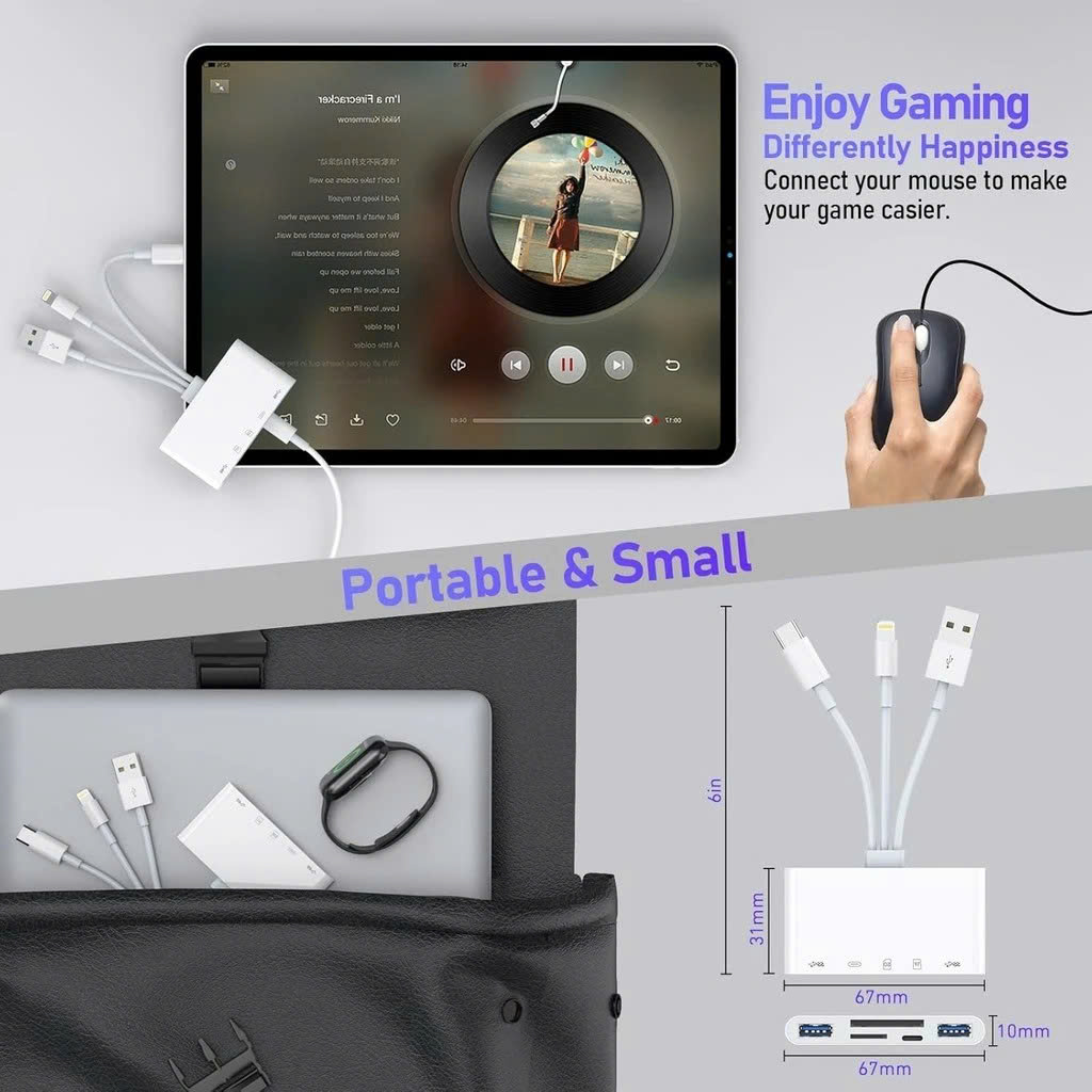 Đa chức năng: Nó có thể kết nối nhiều thiết bị ngoại vi USB hơn, chẳng hạn như máy ảnh, TV, ổ đĩa flash USB, đầu đọc thẻ, v.v. Bạn có thể kết nối bàn phím hoặc chuột PC với Điện thoại / Pad / PC thông qua bộ điều hợp máy ảnh USB để trò chuyện và gõ nhanh hơn và dễ dàng hơn trong khi làm việc.