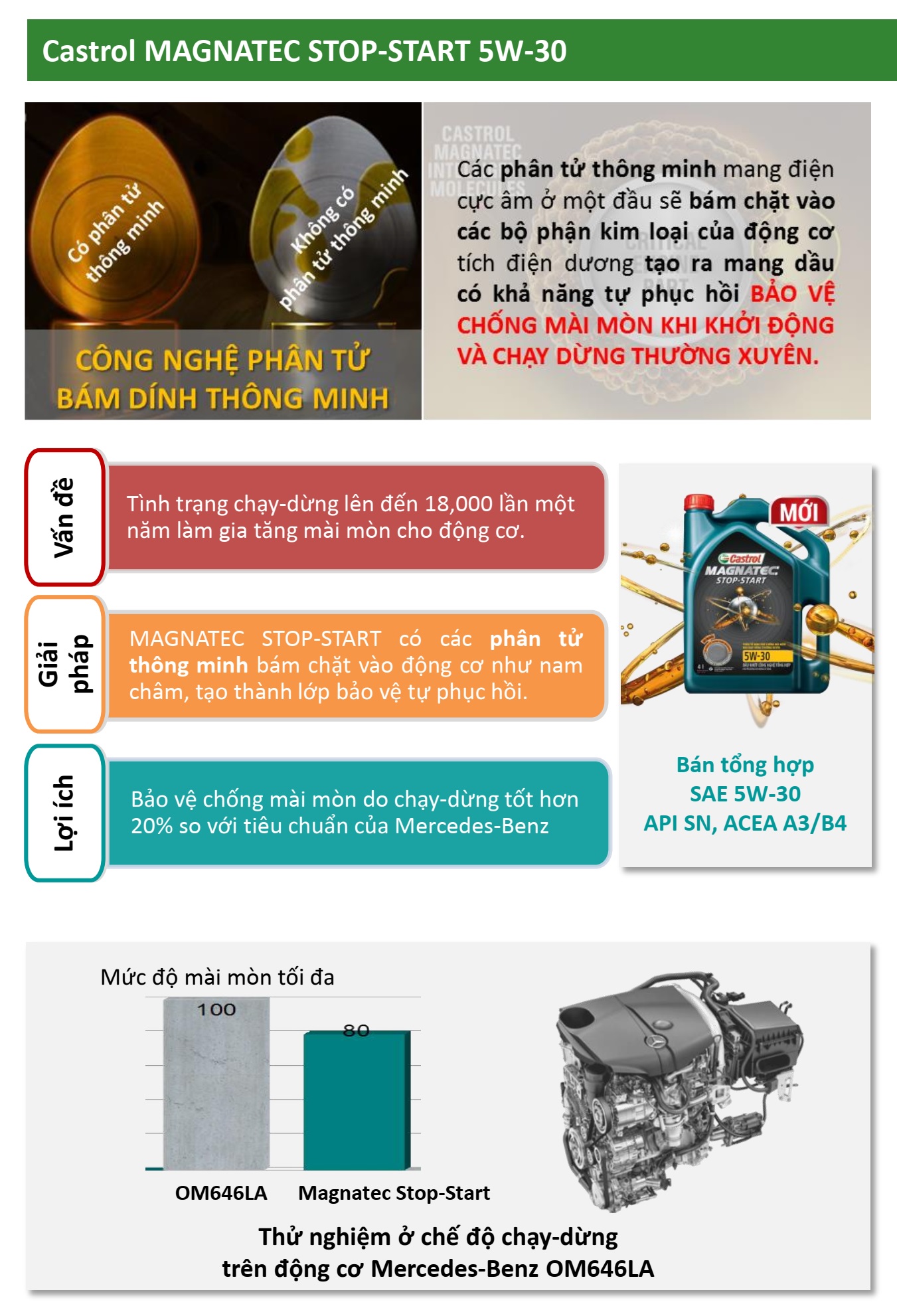Bám dính lên bề mặt kim loại và liên kết với nhau, hình thành màng dầu mạnh mẽ bảo vệ chống mài mòn. Giảm tới 50% mài mòn trong cả hai giai đoạn: làm nóng máy1 và chạy-dừng2. Tiết kiệm nhiên liệu3 khi vận hành trong điều kiện kẹt xe. Castrol MAGNATEC 5W-30 đã được thử nghiệm trên xe hybrid*. Bảo vệ động cơ liên tục ngay từ khi khởi động, ngay cả với các dòng xe được trang bị công nghệ chạy-dừng hiện đại.