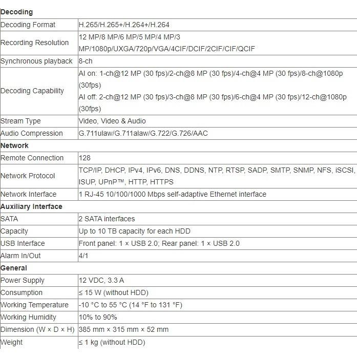 Thông số kỹ thuật đầu ghi hình IP 8 kênh AcuSense HIKVISION DS-7608NXI-K2