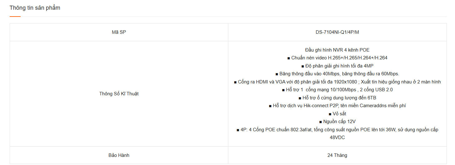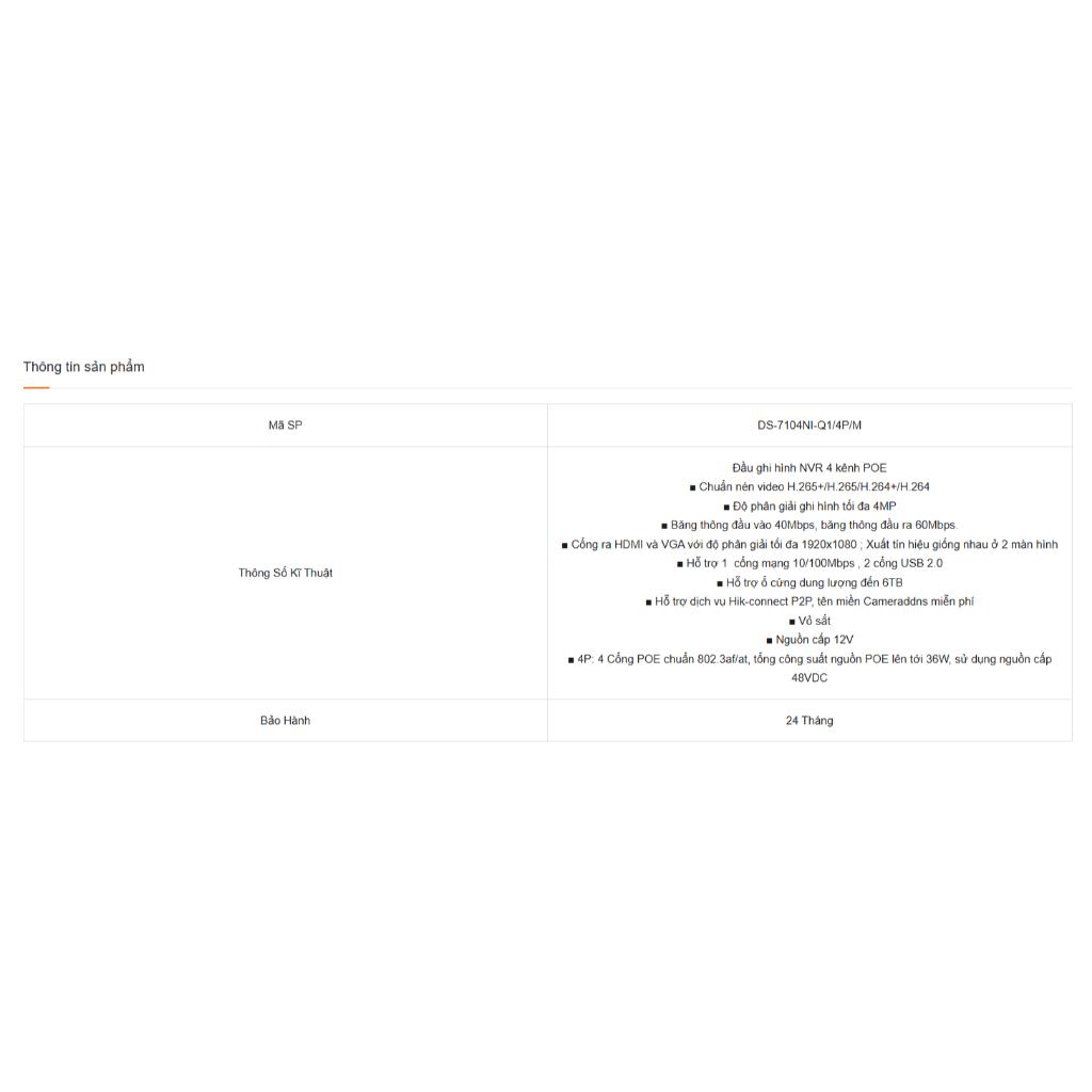 Thông số kỹ thuật đầu ghi IP H.265+ Hikvision DS-7104NI-Q1/4P/M