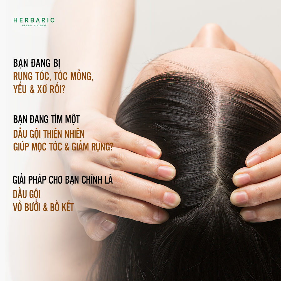 Dầu gội vỏ bưởi & bồ kết HERBARIO giúp giảm rụng tóc*, nuôi dưỡng tóc từ sâu bên trong, cung cấp dưỡng chất giúp tóc chắc khỏe, phục hồi tóc hư tổn do tác động của môi trường và hóa chất, giúp tóc luôn khỏe mạnh, suôn mượt và mềm mại.