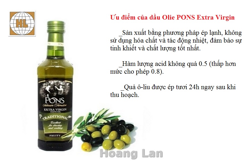 - Dầu Olive Extra Virgin PONS 500ml - Tây Ban Nha ( Chai Thủy Tinh ) - _Thời hạn sử dụng: 30 tháng kể từ ngày sản xuất - _NSX, HSD: Xem trên bao bì. - _Thể tích thực: 500 ml - _Xuất xứ: Euroaliment P.A.C., S.L.U (Tây Ban Nha) -   - Đây là một loại chất béo được chiết xuất từ loại quả của cây Olive hay có tên quốc tế là Olea Europaea. Loại cây này là đặc sản mang tên tuổi của vùng đất Địa Trung Hải. Dầu Olive được sử dụng rộng rãi trong cuộc sống. Tuy nhiên được ưu tiên và chú trọng trong lĩnh vực mỹ phẩm, nấu ăn và dược liệu.  -   - _ Dầu Olive Extra Virgin PONS 250ml - Tây Ban Nha được sản xuất theo phương pháp ép lạnh, không đòi hỏi sử dụng hóa chất hay tác động nhiệt vào quy trình, giúp dầu giữ lại được các chất dinh dưỡng và có độ tinh khiết cao nhất. Vì vậy mà dầu Olive ép lạnh được nghiên cứu là mang lại nhiều lợi ích về sức khỏe hơn dầu Olive thông thường.  -   - _ Phần lớn chất béo chứa trong dầu Olive Pons Extra Virgin đều là chất béo không bão hòa rất tốt cho sức khỏe. Tiêu thụ chất béo không bão hòa giúp giảm khả năng mắc các bệnh tiểu đường loại 2, tim, ung thư và bệnh mãn tính. Dầu Olive ép lạnh cũng chứa ít nhất 30 hợp chất thực vật có lợi, nhiều chất chống oxy hóa mạnh có tác dụng chống viêm, hạ huyết áp, ngăn chặn sự phát triển của một số loại ung thư. Dầu Olive hoàn toàn có thể thay thế dầu ăn thông thường và là thực phẩm bổ sung lành mạnh.  -   - _Dầu có hàm lượng acid không quá 0.5o -   - _Hương vị thơm ngon đậm đà hơn nhờ quả ô-liu được ép tươi ngay sau khi thu hoạch -   - _Thành phần: Dầu Olive nguyên chất 100% được sản xuất theo phương pháp ép lạnh quả tươi ngay sau khi thu hoạch. -