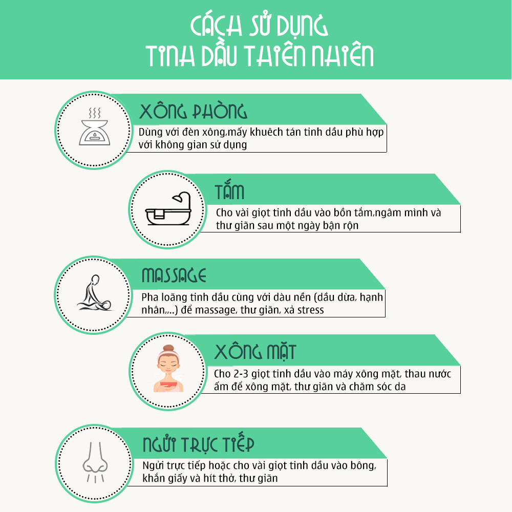 ► Massage: cho 3-5 giọt tinh dầu tràm gió vào 30ml dầu nền (dầu jojoba, hạnh nhân, olive,) và massage khắp cơ thể giúp thư giãn, làm ấm cơ thể, lưu thông tuần hoàn, giảm tình trạng đau nhức, căng cơ.