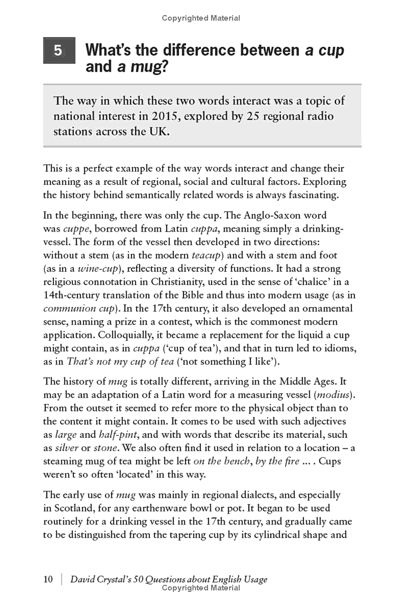 David Crystal answers fifty questions about language usage, from general enquiries to specific points of grammar, pronunciation, orthography, vocabulary, idiom, and style. In this compact, user-friendly book, David Crystal draws on his extensive knowledge and experience to answer questions from English language teachers and learners from around the world. The book covers topics ranging from general enquiries about the language as a whole to specific points of grammar, pronunciation, orthography, vocabulary, idiom and style. The author's responses are illustrated by personal anecdotes, placed within historical and literary context and supported by research and corpus data to provide unique, authentic insights.