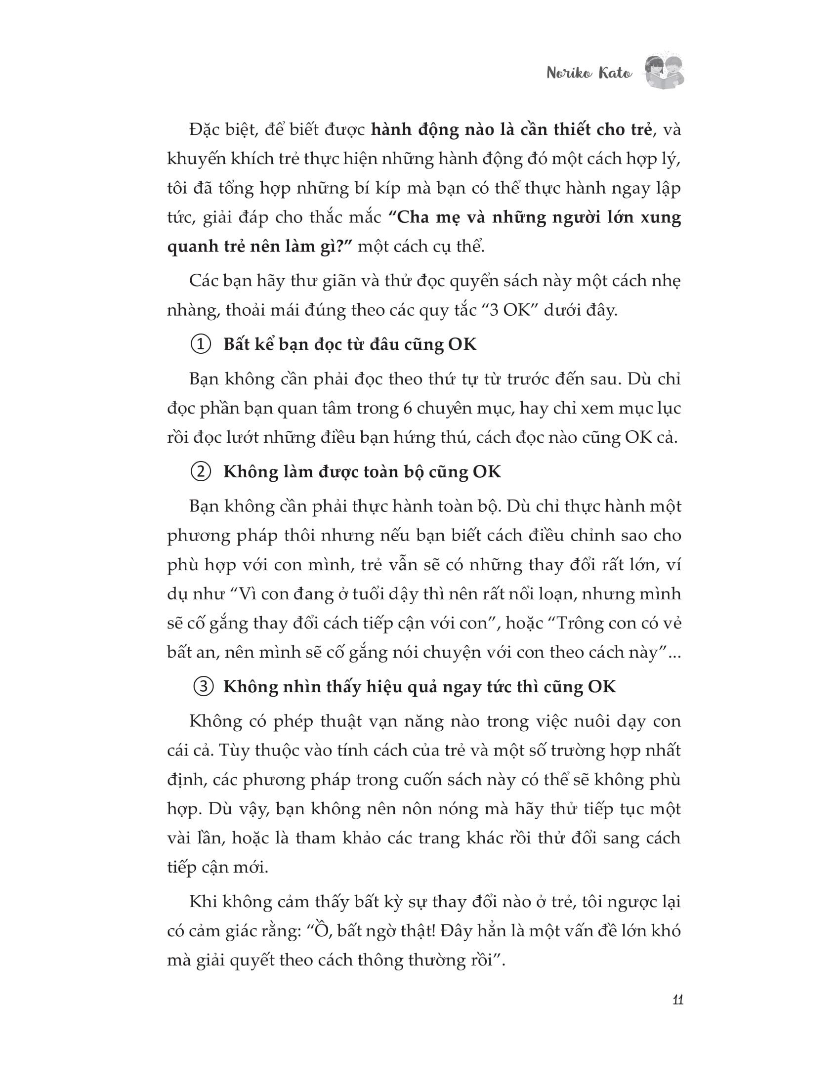 Bạn không cần phải đọc cuốn sách này theo thứ tự từ trước đến sau. Dù chỉ đọc các phần mà bạn quan tâm, hay chỉ xem mục lục rồi đọc lướt qua những điều khiến bạn hứng thú, cách đọc nào cũng được. Bạn dĩ nhiên không cần phải thực hành toàn bộ. Dù chỉ thực hành một phương pháp thôi là trẻ vẫn sẽ có những thay đổi rất lớn.