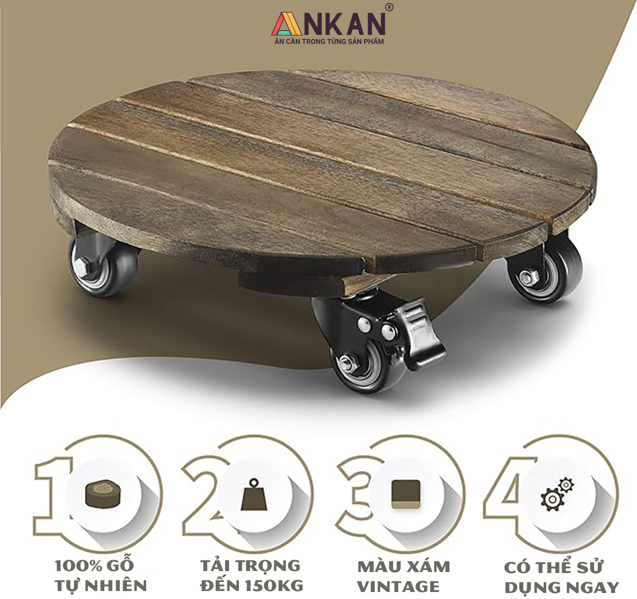 ƯU ĐIỂM ĐẾ LÓT CHẬU CÂY CÓ BÁNH XE ANKAN ★ Gỗ tràm bông vàng được chọn từ gỗ nguyên, gỗ mới, ít mắt gỗ và được gia công tỉ mĩ, ít trầy xướt. ★ Xử lý 2