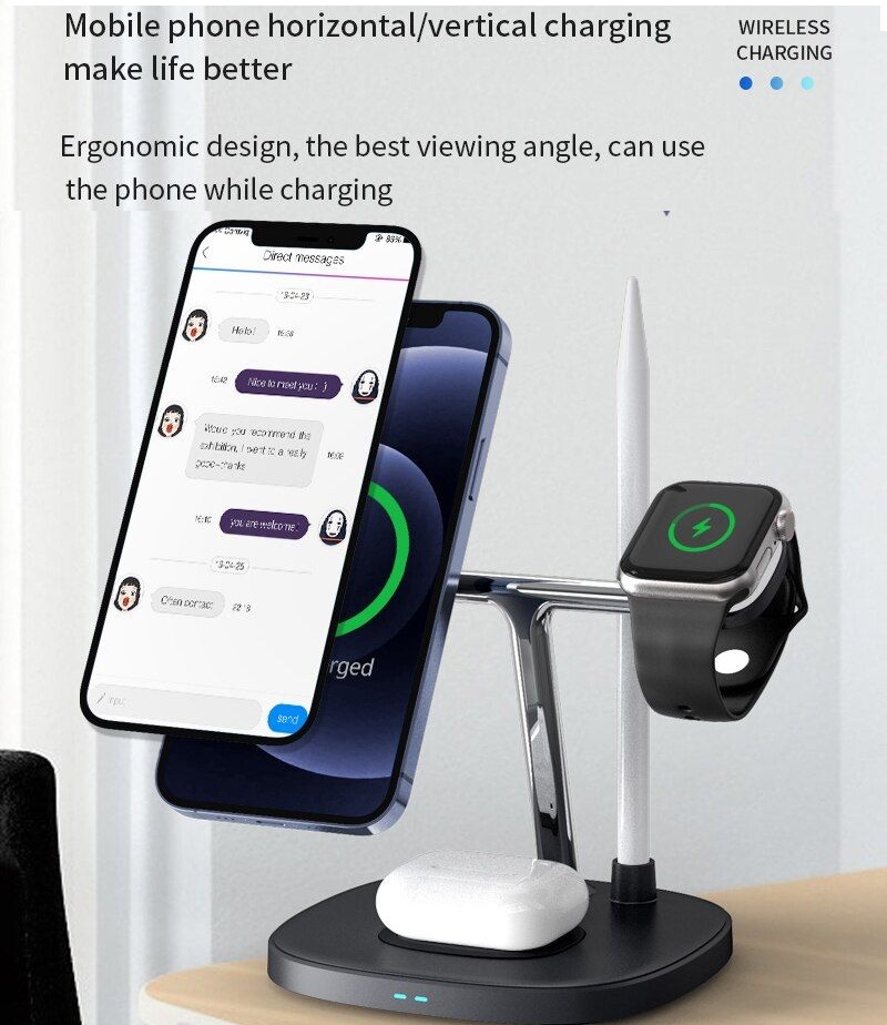 Sạc Wiwu Automatic Positioning 4 in 1 M11  Thương hiệu: Wiwu  Mô tả sản phẩm  - Chất liệu: hợp kim nhôm chất lượng cao và bền  - Bộ sạc không dây 4 in 1 và là giá đỡ để bàn cho điện thoại  - Hỗ trợ sạc không dây nhanh  - Cuộn dây có thể tháo rời, ngang và dọc  - Định vị chính xác - Sạc có chế độ đèn ban đêm ánh sáng dịu nhẹ và thoải mái - Xung quanh sạc ánh sáng ấm áp và sáng sủa  - Điều chỉnh đa hướng sử dụng trong nhiều tình huống  - Sạc có đồng hồ hiển thị giờ  - Hỗ trợ cho tất cả các máy có chế độ sạc không dây. Bộ chuyển đổi dành cho di động 4.7- 6.9inch - Đầu ra: 5V = 3A 9V = 2.3A - Giao diện: loại C - Tỉ lệ đầu ra: 15W ( hỗ trợ 10W/7,5W,5W)