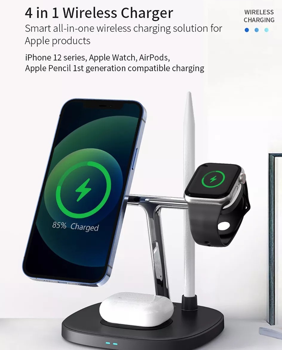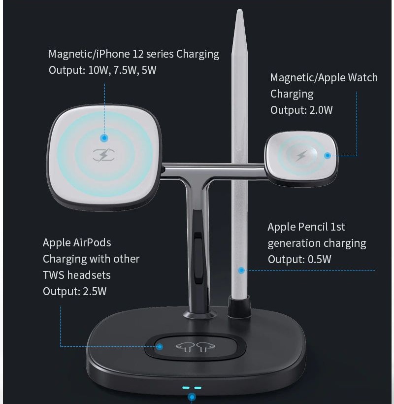 Đế sạc không dây sạc nhanh 15W 4 in 1 hỗ trợ sạc dành cho tai nghe / iWatch / Pencil /  iPhone hiệu WIWU Power Air Wireless Charger M8 (liên kết từ tính mạnh mẽ, Chuẩn Qi, Smartchip)           DÀNH CHO CÁC FAN NHÀ TÁO Bạn đang sở hữu nhiều sản phẩm của nhà Táo. Bạn có quá nhiều dây sạc cho từng loại sản phẩm khác nhau như iPhone, iWatch, tai nghe, Pencil và bạn luôn gặp phiền phức với chỗ dây sạc rối rắm trên bàn. Đừng lo, hãy để chúng tôi giới thiệu đến bạn sản phẩm đến từ nhà WIWU đó là Đế sạc nhanh không dây 15W 4 in 1 hiệu WIWU Power Air Wireless Charger M8 Đây sẽ là sản phẩm hữu ích giúp bạn giải quyết được phiền não về dây, cáp sạc từ trước đến nay. Đế sạc nhanh không dây 15W 4 in 1 hiệu WIWU Power Air Wireless Charger M8 có kiểu dáng thiết kế tương tự đế sạc không dây Air Power của , cực kỳ mỏng, nhỏ gọn           SẠC NHANH THÔNG MINH Đế sạc nhanh không dây 15W 4 in 1 hiệu WIWU Power Air Wireless Charger M8 sạc tất cả trong một, sạc nhanh không dây 15W, 4 chíp thông minh giúp việc sạc thiết bị của chúng ta thuận tiện hơn. Thiết bị có công suất sạc cho từng loại sản phẩm như sau: