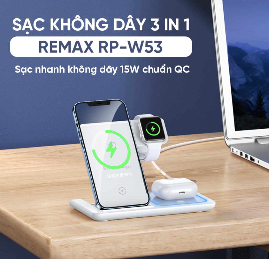Mua tại TiktokĐế Sạc Nhanh Không Dây Đa Năng 3in1 Remax RP-W53 - Hỗ Trợ Sạc Nhanh Lên Đến 15W