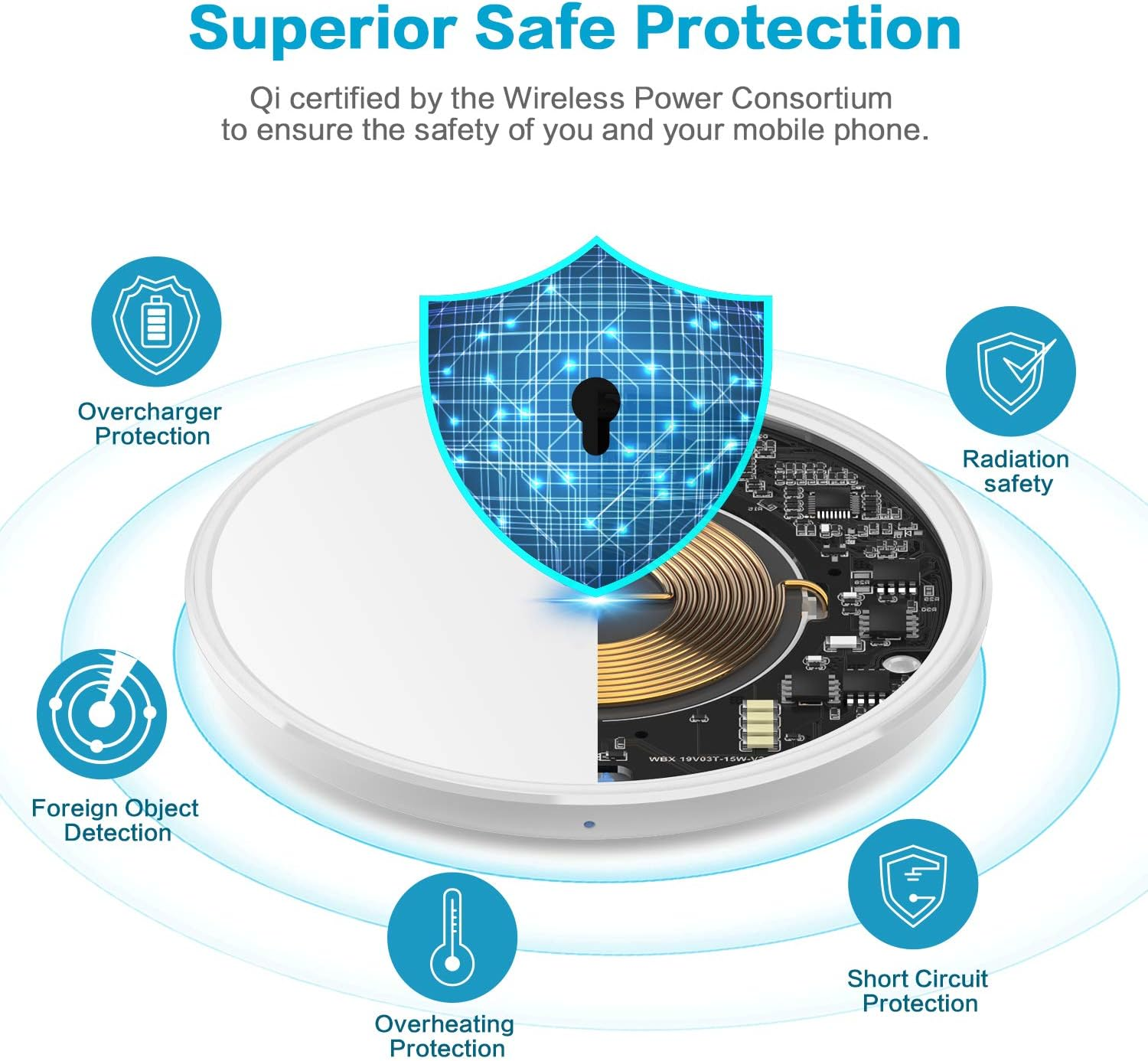 Bảo vệ an toàn tuyệt đối cho thiết bị và người sử dụng. Khả năng tự động ngắt điện khi sạc đầy, giúp bảo vệ pin điện thoại, tăng tuổi thọ pin , không gây tác hại đến cổng sạc cũng như linh kiện bên trong máy. Khi không sử dụng sạc không dây sẽ tự động chuyển sang chế độ chờ giúp tiết kiệm điện năng tiêu thụ.