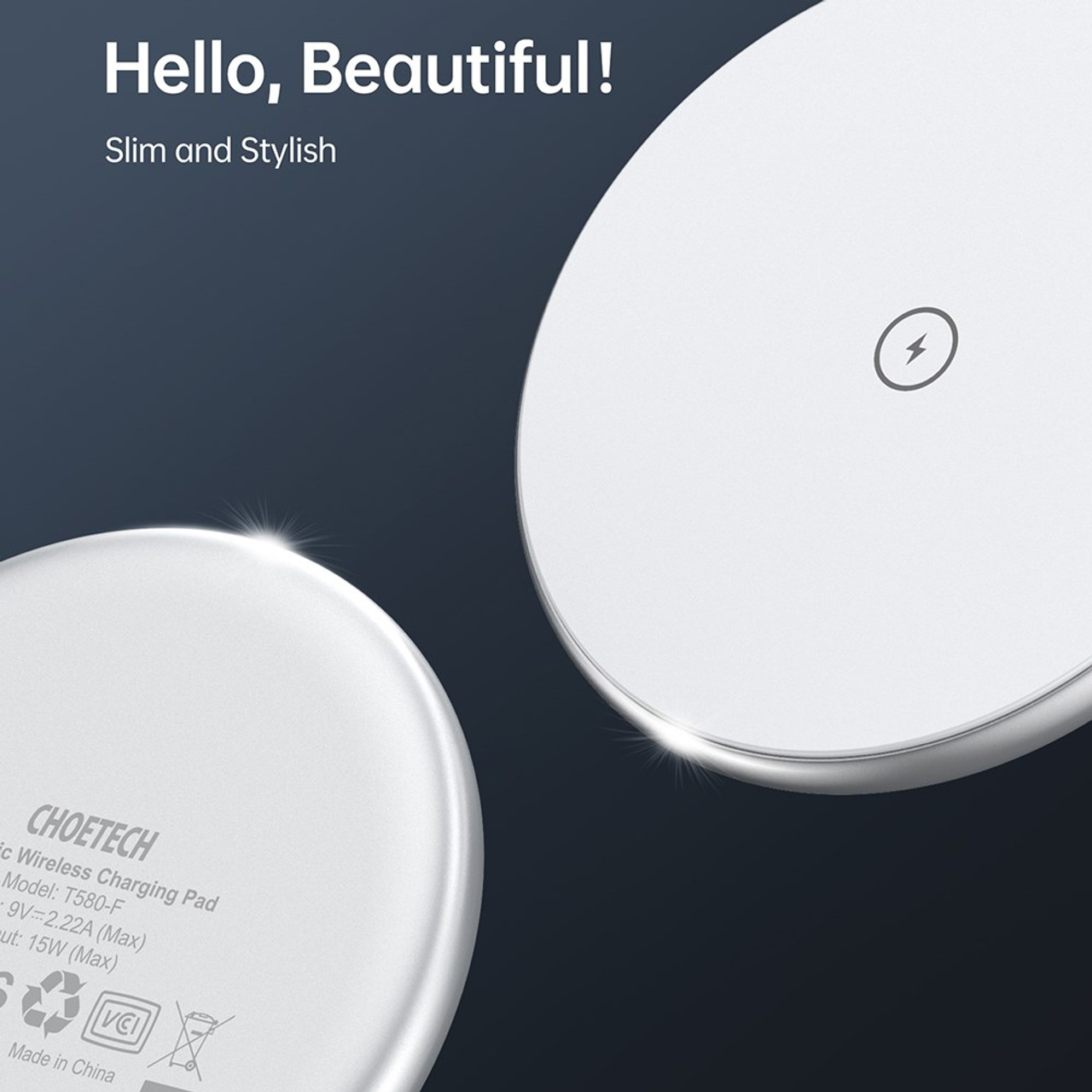 Đế sạc không dây sạc nhanh 15W chuẩn Qi hiệu CHOETECH T580-F có hình tròn màu trắng , thiết kế tổng thể đơn giản giống nhưng cũng không kém phần sang trọng và đẹp mắt . Bề mặt được phủ một sơn bóng bẩy chống trầy xước điện thoại khi sạc pin.
