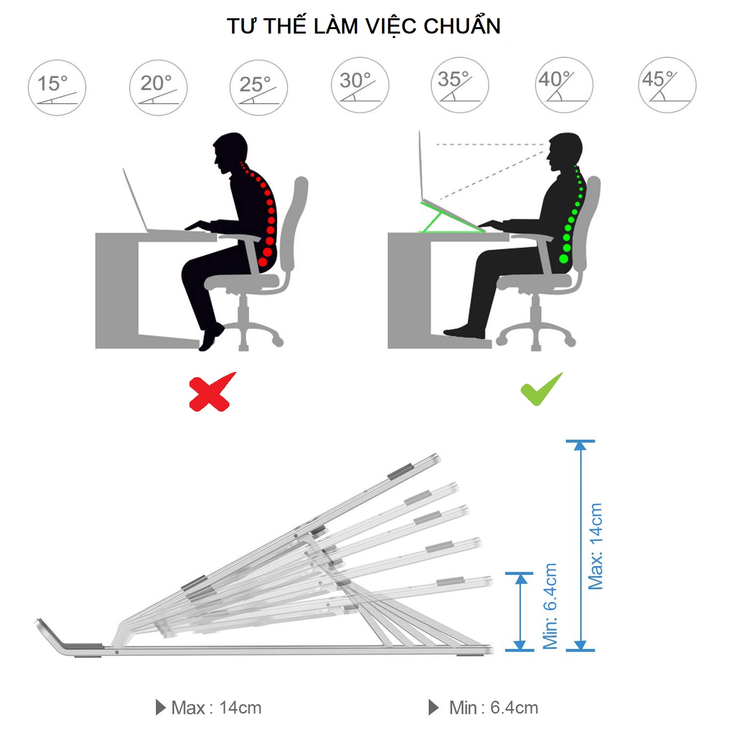 Đế Tản Nhiệt Cao Cấp Dành Cho Macbook, Laptop - Tiện Lợi Cho Việc Mang Theo - Tùy Chỉnh Độ Cao Và Gấp Gọn - Chất Liệu Hợp Kim Nhôm - Có 07 Vị Trí Điều Chỉnh Góc Độ - Hàng Chính Hãng PaKaSa  Đế tản nhiệt dùng cho Laptop & Tablet Giúp bạn sử dụng máy đúng tư thế ngồi tốt cho sức khỏe Còn hỗ trợ máy laptop được tản nhiệt tốt hơn Thiết kế có thể xếp gọn lại dễ dàng theo theo Có nhiều gốc độ cao điều chỉnh phù hợp mọi tư thế ngồi Sử dụng cho tất cả các dòng máy từ 11~17 inch  Chất liệu bằng hợp kim nhôm cao cấp  Nhiều lớp nhựa silicon chống trày máy và cố định giá đỡ  Chịu được tải trọng lớn đến 20kg   BẠN CÓ BIẾT? Làm việc với máy tính thời gian dài sai tư thế, cúi đầu trong thời gian dài có thể gây nguy hại cho cột sống của bạn và làm tăng tốc độ thoái hóa cột sống. Thói quen dùng máy tính như thế có thể khiến các đĩa đệm thắt lưng bị đẩy lồi ra, mà hệ lụy cuối cùng là thoát vị đĩa đệm.   Sản phẩm Giá đỡ laptop cao cấp đến từ thương hiệu PaKaSa sẽ giúp bạn giải quyết được vấn đề này một cách dễ dàng. Sản phẩm được thiết kế thông minh với 07 chế độ điều chỉnh góc nhìn giúp bạn luôn có thể sử dụng máy tính ở tư thế thoải mái nhất.    Thiết Kế Đơn Giản Tản Nhiệt Nhanh Đế tản nhiệt có sự thiết kế gập gọn đơn giản điều chỉnh những góc độ nghiêng linh hoạt, độ bám cố định chắc chắn để được tất cả các dòng laptop, không gian tản nhiệt rộng thoải mái khi sử dụng không gây nóng máy.                Tiện Lợi Cho Việc Mang Theo​  Đế tản nhiệt phù hợp sử dụng ở bất cứ nơi đâu như ở nhà, ngồi quán cafe,văn phòng hay đi du lịch đều được với sự gập lại đơn giản và chất liệu được làm bằng hợp kim siêu mỏng bền chắc cũng không sợ dễ bị gãy khi mang theo bỏ trong balo hay túi xách.        Đế Tản Nhiệt Có Độ Bám Cố Định Cao Khi sử dụng đế tản nhiệt người sử dụng quan tâm nhất là lúc đánh chữ máy dễ bị rung và bập bênh hay không. Đây Đế Tản Nhiệt này được thiết kế các khung sườn chắc và có các miếng cao su tạo độ bám máy nên không có trường hợp xảy ra máy bị trơn trượt.                                            Tương Thích Nhiều Kích Thước​ Với kích thước gập gọn lại và mở rộng có thể điều chỉnh để được kích thước của tất cả cừ 11 inch đến 17 inch sử dụng thoải mái và chắc chắn.ác dòng máy laptop                                          Chân thành cảm ơn quý khách!!