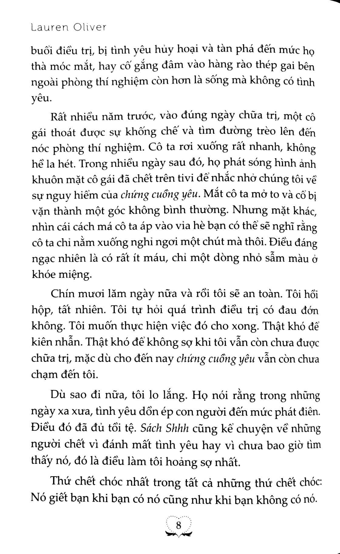 Thế giới sẽ ra sao nếu không còn tình yêu? Bạn có thể tìm câu trả lời trong bộ 3 tác phẩm Delirium của tác giả Lauren Oliver. Một thế giới “phản địa đàng” khi tất cả cư dân đủ 18 tuổi sẽ được chữa trị khỏi chứng cuồng yêu. Sau đó họ sẽ sống khỏe mạnh, an toàn và hạnh phúc đến cuối đời.