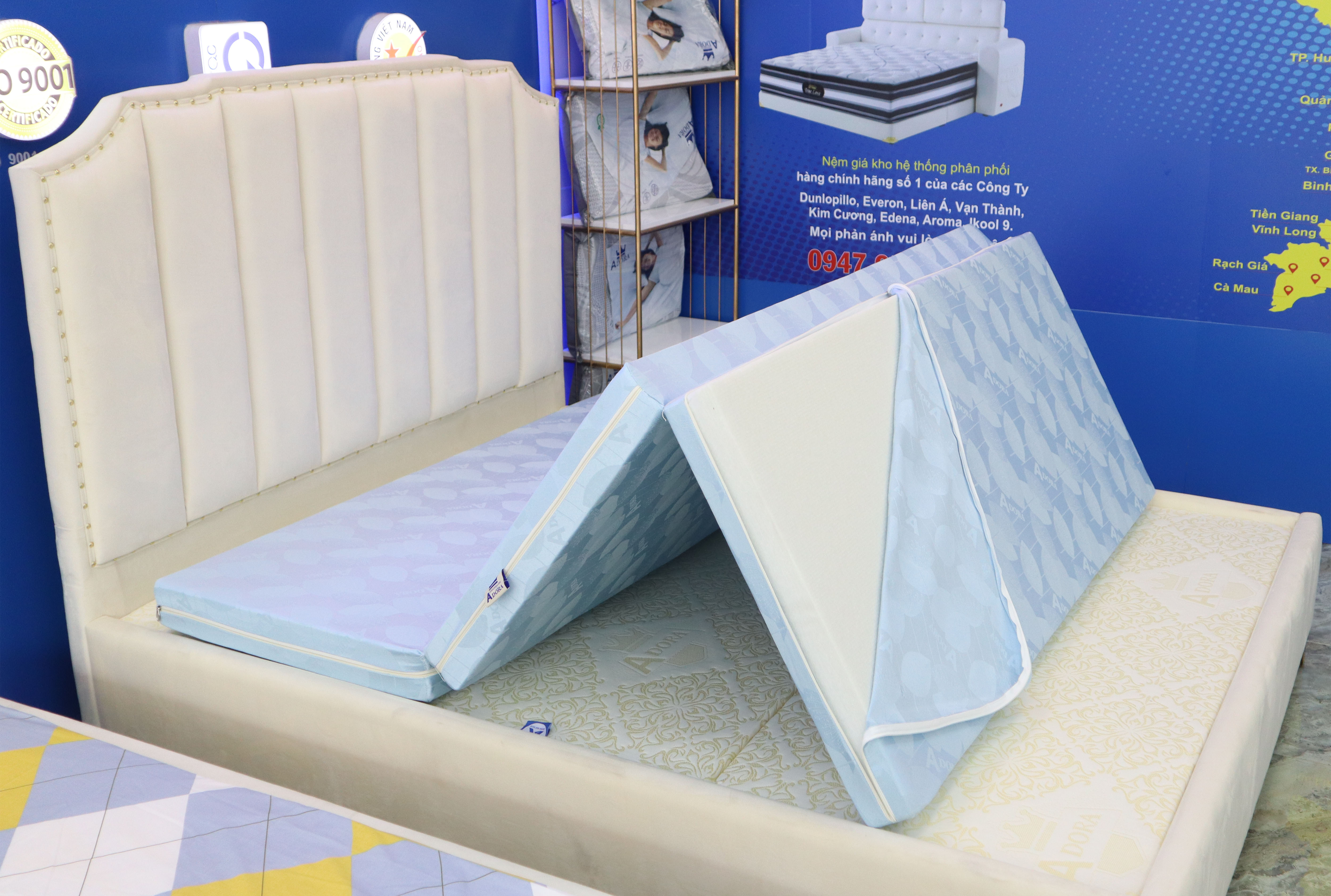- Đệm có thiết kế gấp 3 tiện dụng, phù hợp với các không gian nhà hay phòng chật hẹp hiện nay giúp thoải mái cất giữ khi không sử dụng và di chuyển dễ