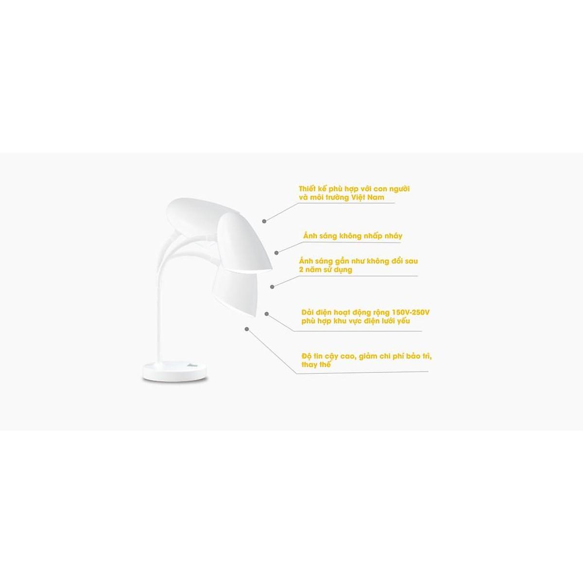 Model: Công suất: 5W Điện áp: 220V/50Hz Màu ánh sáng: Trắng/ Vàng Độ rọi trên mặt bàn: > 700 lux: Đèn bàn LED Rạng Đông bảo vệ thị lực Cần đèn linh hoạt, dễ dàng