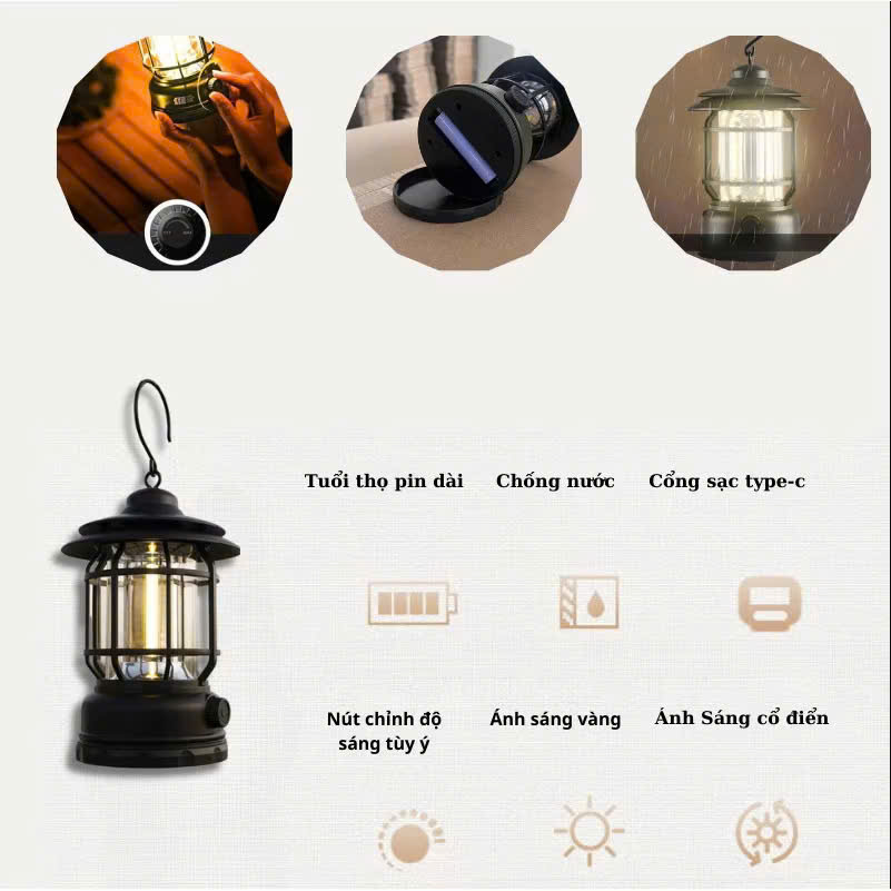 Ánh Sáng Vàng Ấm Áp, Trang Trí Đẹp Mắt: Đèn phát ra ánh sáng vàng dịu nhẹ, tạo không gian ấm cúng và dễ chịu, rất thích hợp cho việc trang trí và tạo không khí thoải mái trong các buổi tiệc, cắm trại hay các hoạt động ngoài trời vào ban đêm. Ánh sáng vàng không chỉ giúp chiếu sáng mà còn làm tăng vẻ đẹp cho không gian của bạn.
