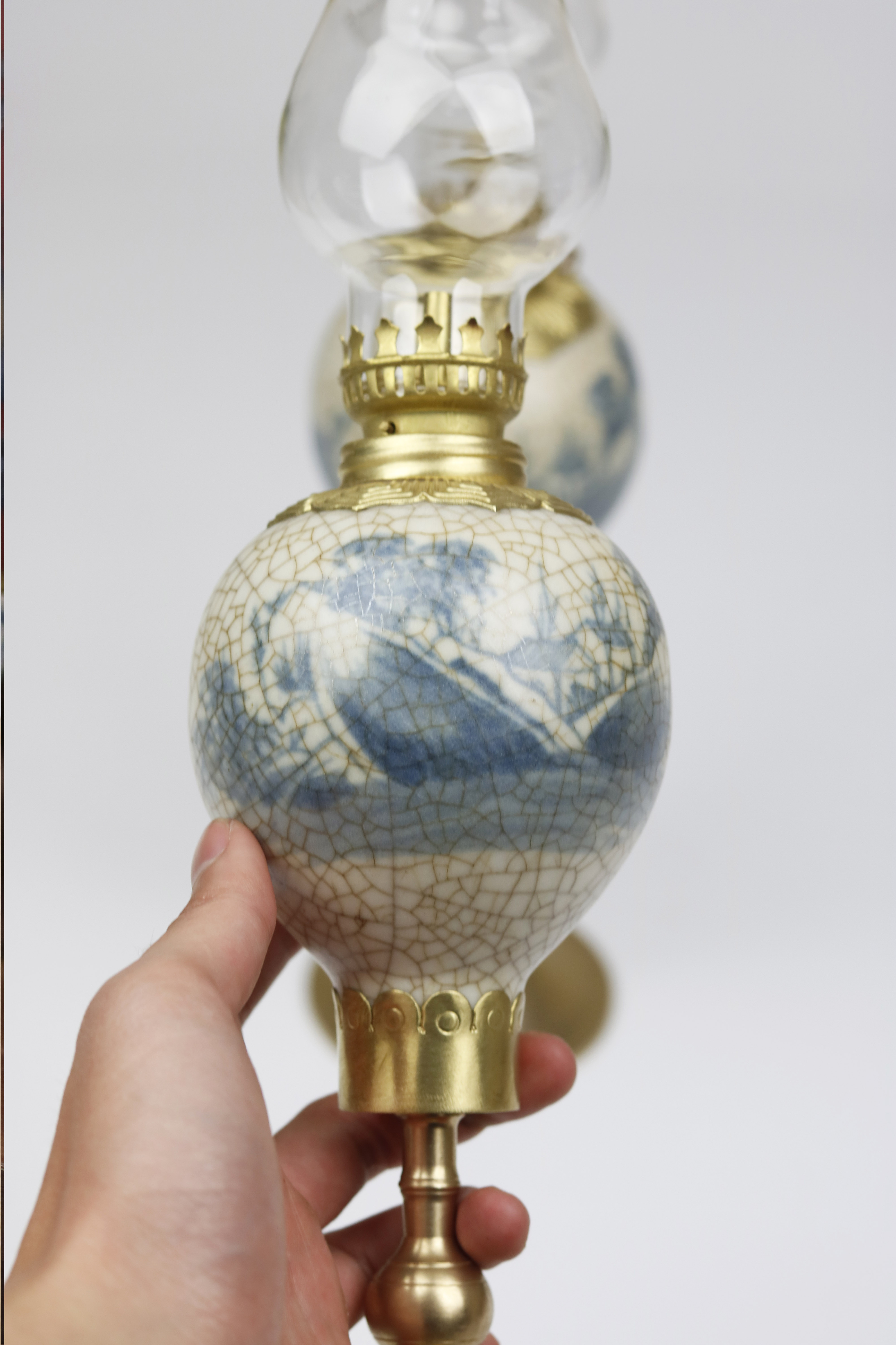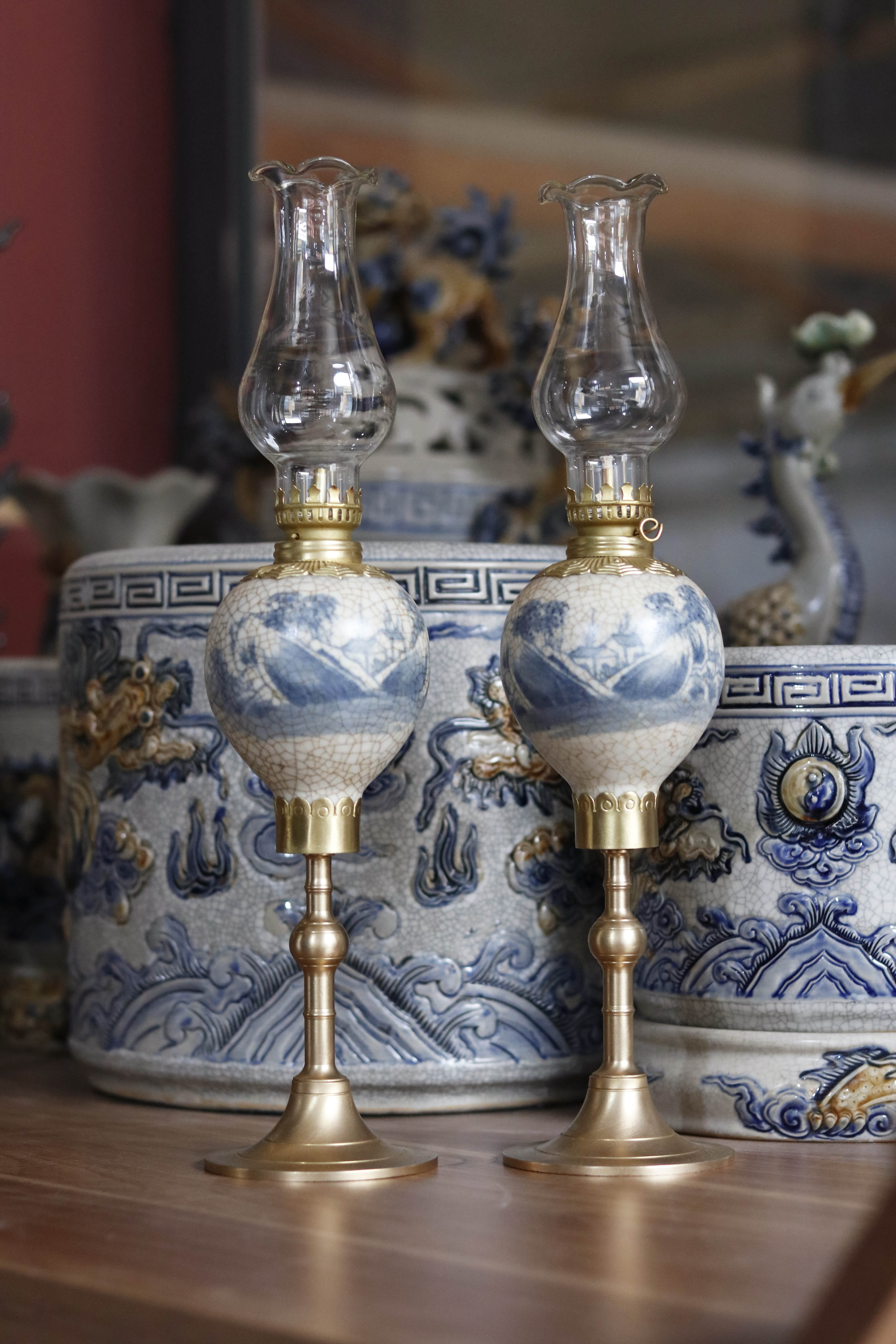 Đèn dầu Bát Tràng - Sản phẩm bao gồm: đèn + bóng đèn - Đèn dầu Bát Tràng men lam bọc đồng được nung ở nhiệt độ 1200 đến 1300 độ C nên có độ
