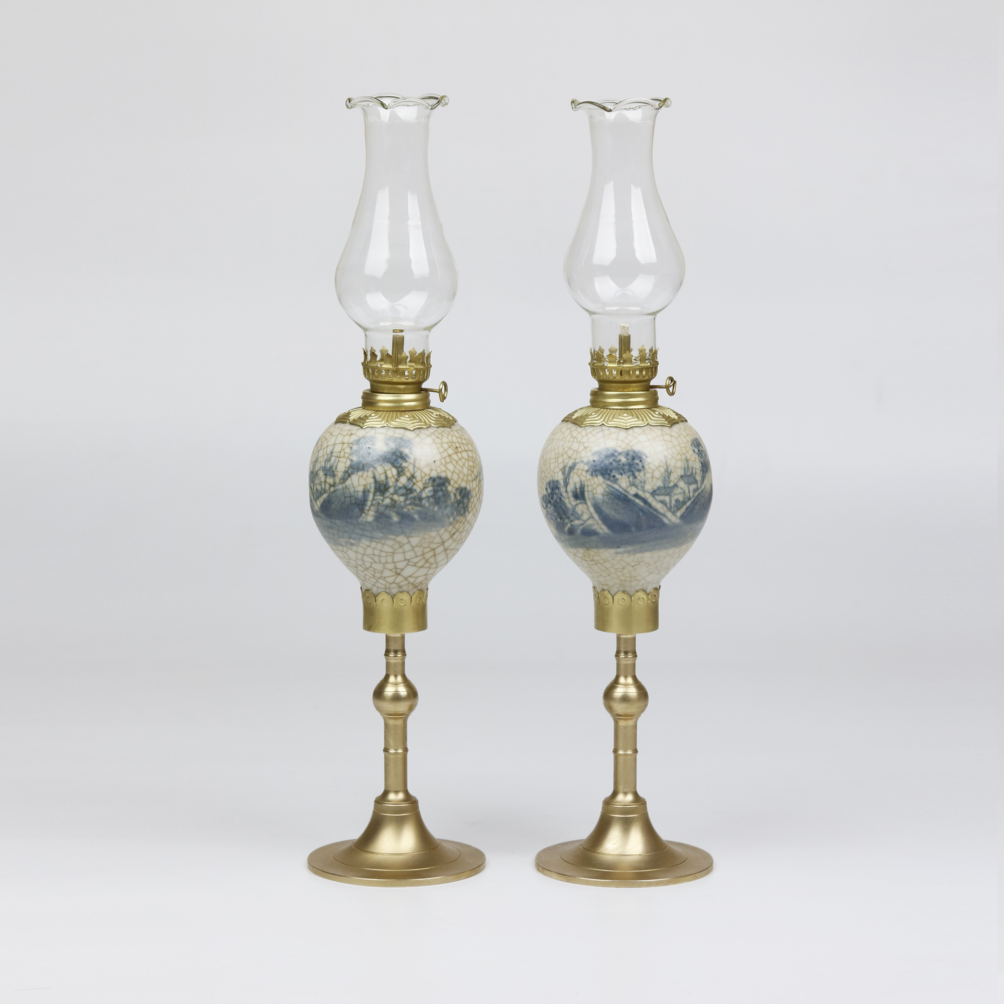 CẶP ĐÈN DẦU GỐM MEM RẠN BỌC ĐỒNG VẼ SƠN THUỶ