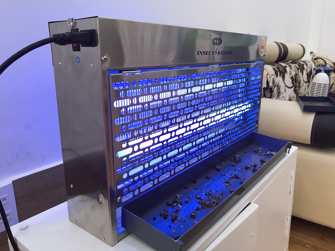 Cắm điện trực tiếp 220v. Có công tắc tắt mở, khay đựng côn trùng chết ở phía dươi cùng sản phẩm.