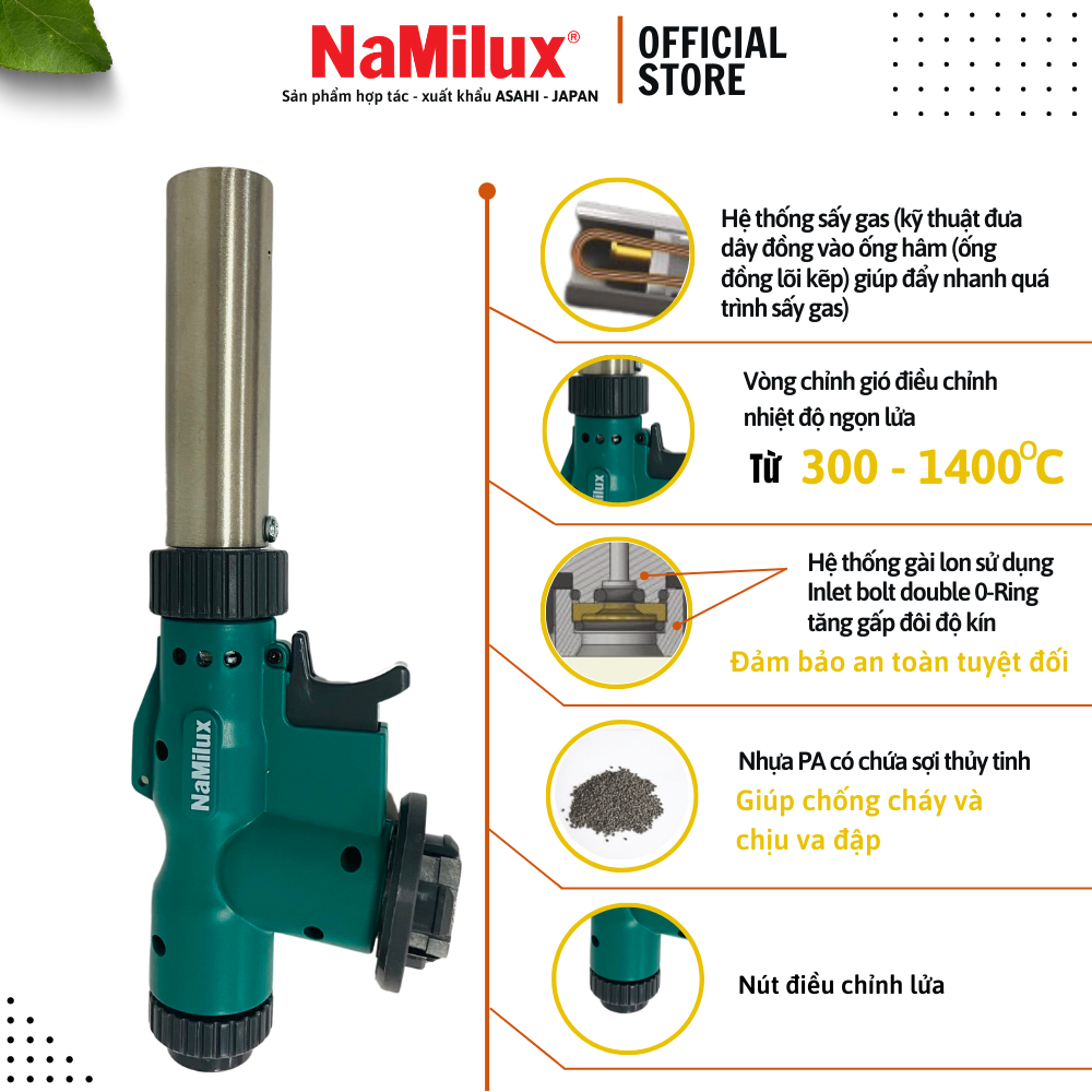 Đèn khò gas Namilux NA-187-VN sử dụng công nghệ sấy gas đốt nóng ống đồng lõi kép, đẩy nhanh quá trình sấy gas, ổn định ngọn lửa khi quay ngược đầu khò, hoàn toàn không