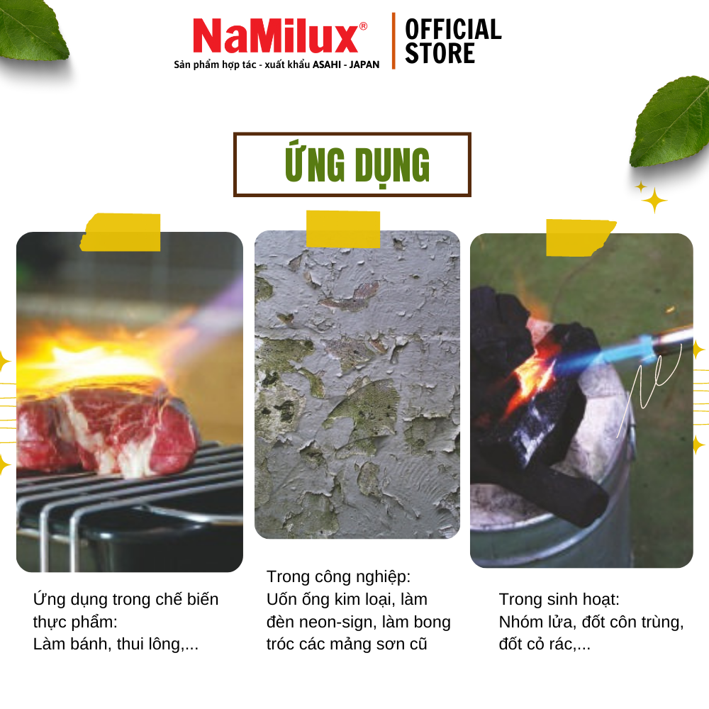 Sản phẩm không chỉ dành cho nhà bếp mà còn có thể sử dụng theo nhiều cách như: nhóm lửa, đốt rác & côn trùng, nướng thịt, nướng đồ BBQ , cắm trại & cho các công việc thủ công cần nhiệt độ cao như uốn kim loại, làm đèn Neon -Sign, thợ điện nước…
