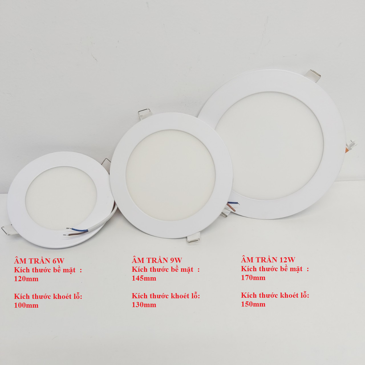 - Khi chiếu sáng đảm bảo không phát ra các tia có hại sức khỏe của người dùng như tia IE, UV ĐÈN LED ÂM TRẦN DOWNLIGHT 6W Công suất : 6W Kích thước bề mặt : 120mm Kích thước khoét lỗ : 100mm ĐÈN LED ÂM TRẦN DOWNLIGHT 9W Công suất : 9W Kích thước bề mặt : 145mm Kích thước khoét lỗ : 130mm ĐÈN LED ÂM TRẦN DOWNLIGHT 12W Công suất : 12W Đường kính ngoài : 170 mm Kích thước khoét lỗ : 158-165 mm ĐÈN LED ÂM TRẦN DOWNLIGHT 18W Công suất : 18W Kích thước ngoài : 225mm Kích thước khoét lỗ : 205mm